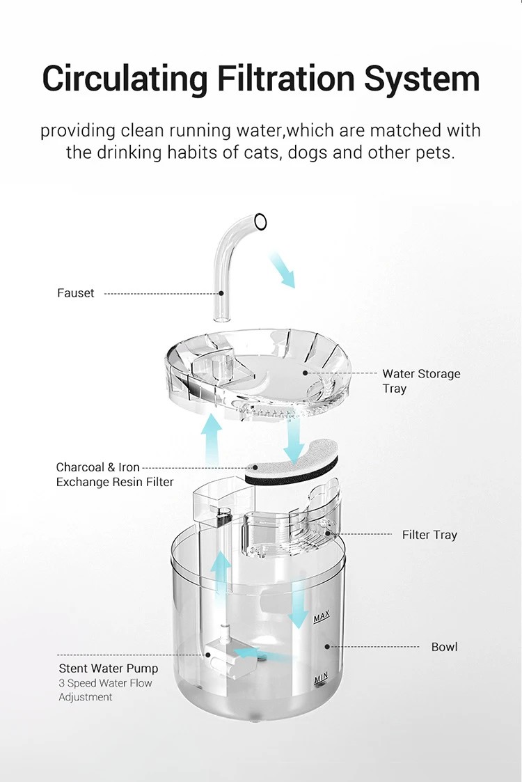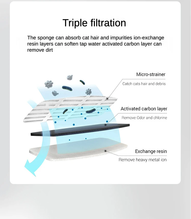 1. Циркулирующая система фильтрации для обеспечения чистой проточной воды для кошек или собак и других домашних животных2. Тройная фильтрация, губка поглощает кошачьи волосы и загрязнения, слой из ионообменной смолы может смягчить водопроводную воду, а слой из активированного угля удаляет грязь3. Конструкция угла наклона 6 ° больше подходит для домашних животных, чтобы пить, уменьшить давление на позвоночник питомца & # x27;s, И это не так легко моется домашних животных & # x27; Невысокий массивный каблук, подбородок4. Интеллектуальный инфракрасный датчик, более энергосберегающий, и продлевает срок службы диспенсера воды