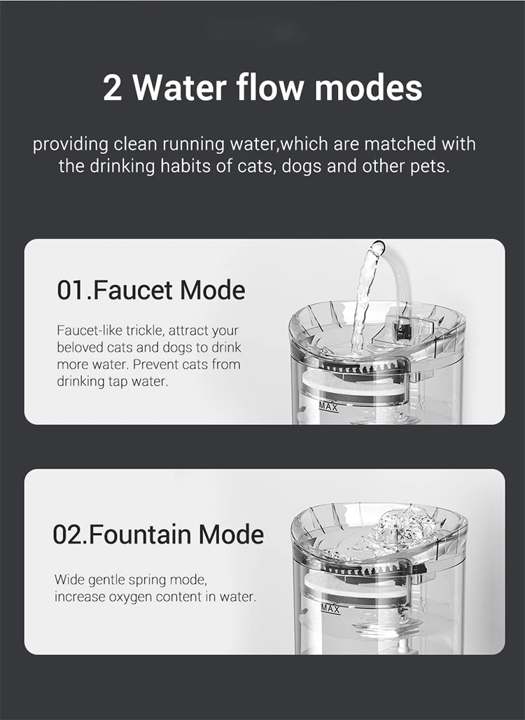 Полностью прозрачный дизайн.2Л большой емкости отлично подходит для собак, кошек, нескольких домашних животных.2 режима потока воды, обеспечивая чистую проточную воду, делают ваших питомцев счастливее и здоровее.