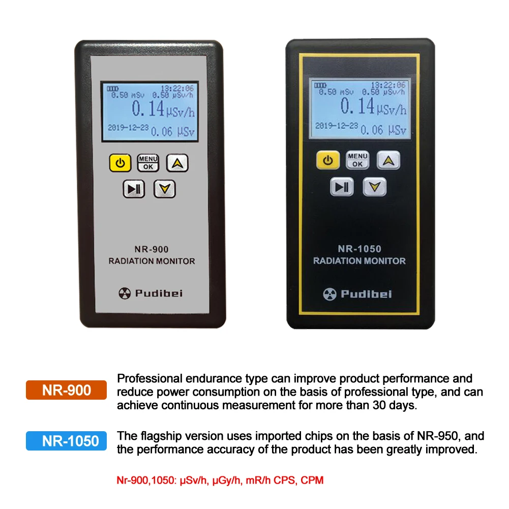 NR-950 имеет пять единиц измерения: uSv/h, uGy/h, mR/h, cps, cpm, и этот тип еще больше улучшает производительность продукта, уменьшая при этом энергопотребление.