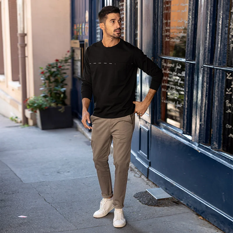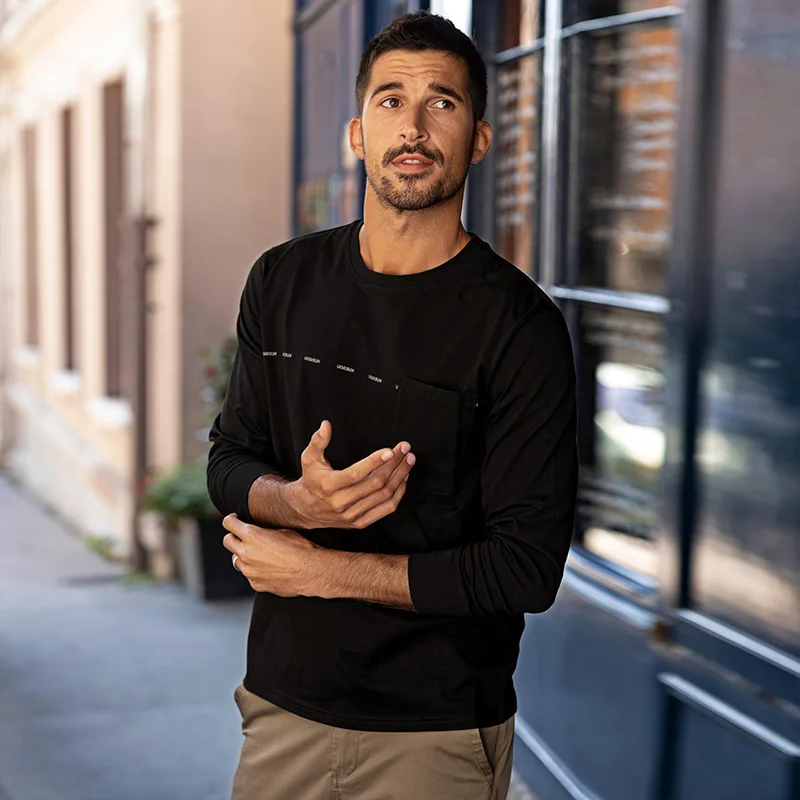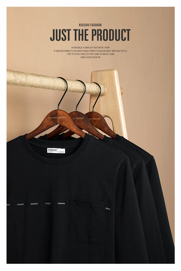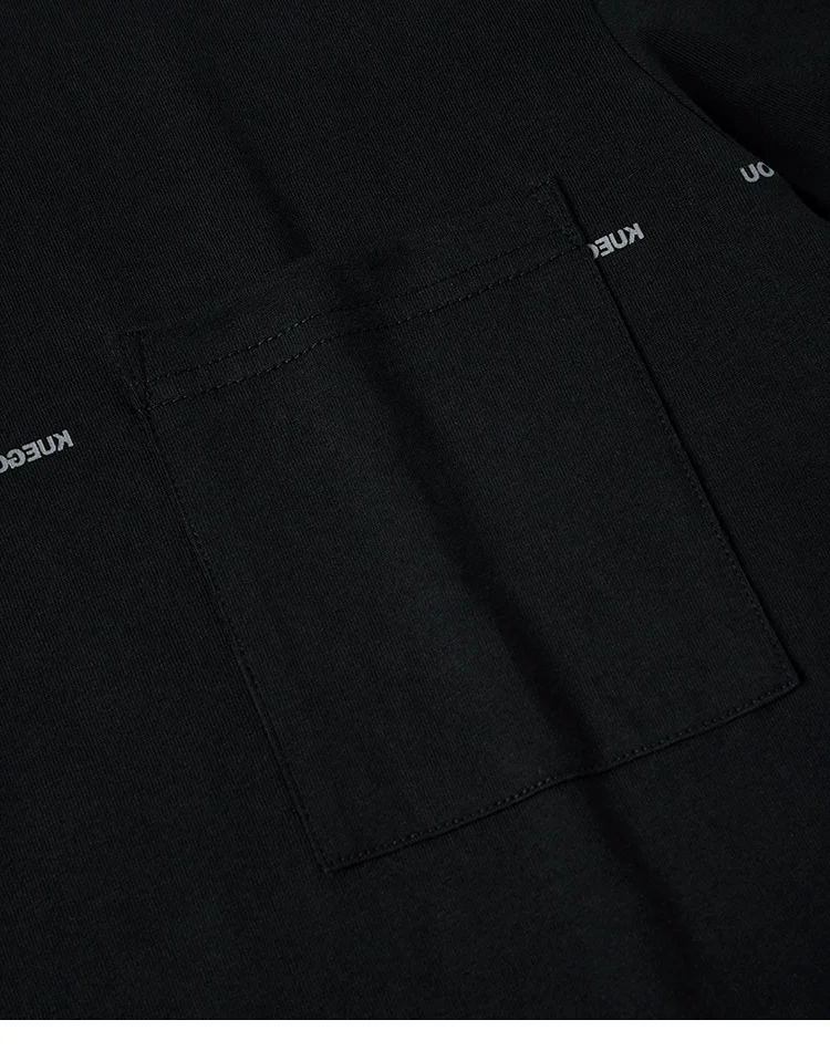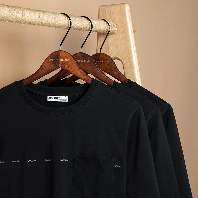 Мужская футболка с длинным рукавом KUEGOU, черная хлопковая футболка с длинным рукавом, с нагрудным карманом, осень 2022