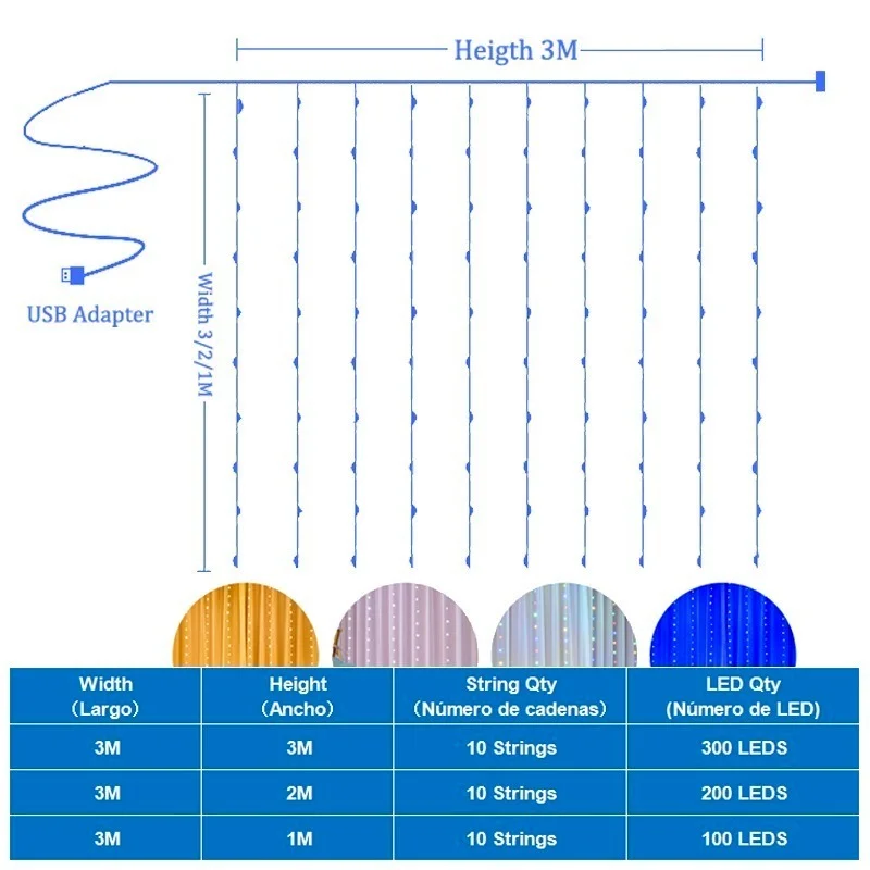 Package Contents3*3m 300LED/3*2m 200LED/3*1m 100LED