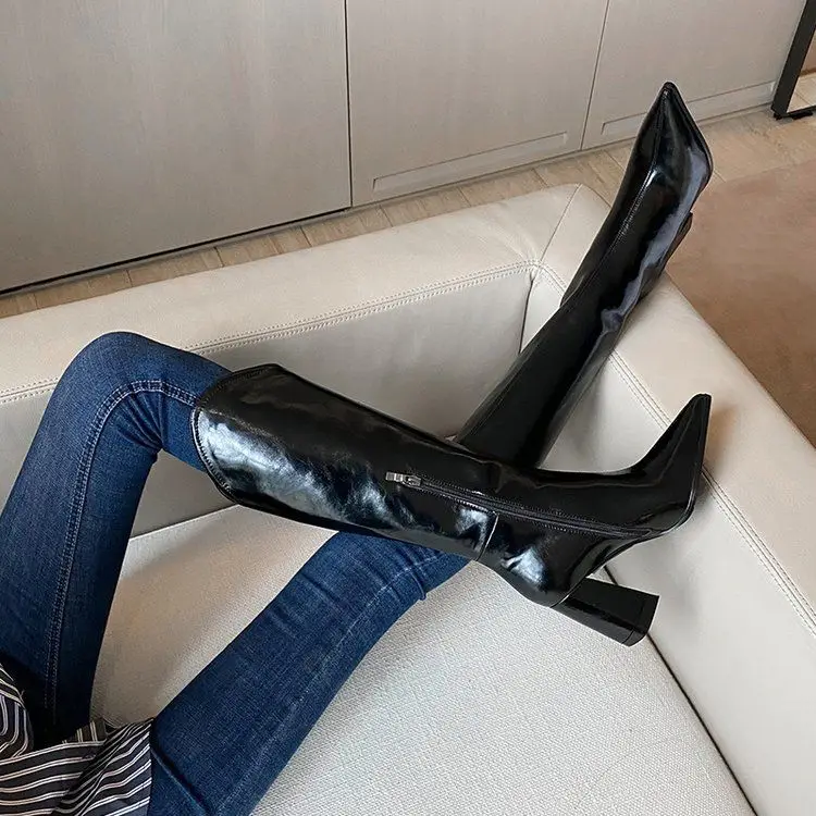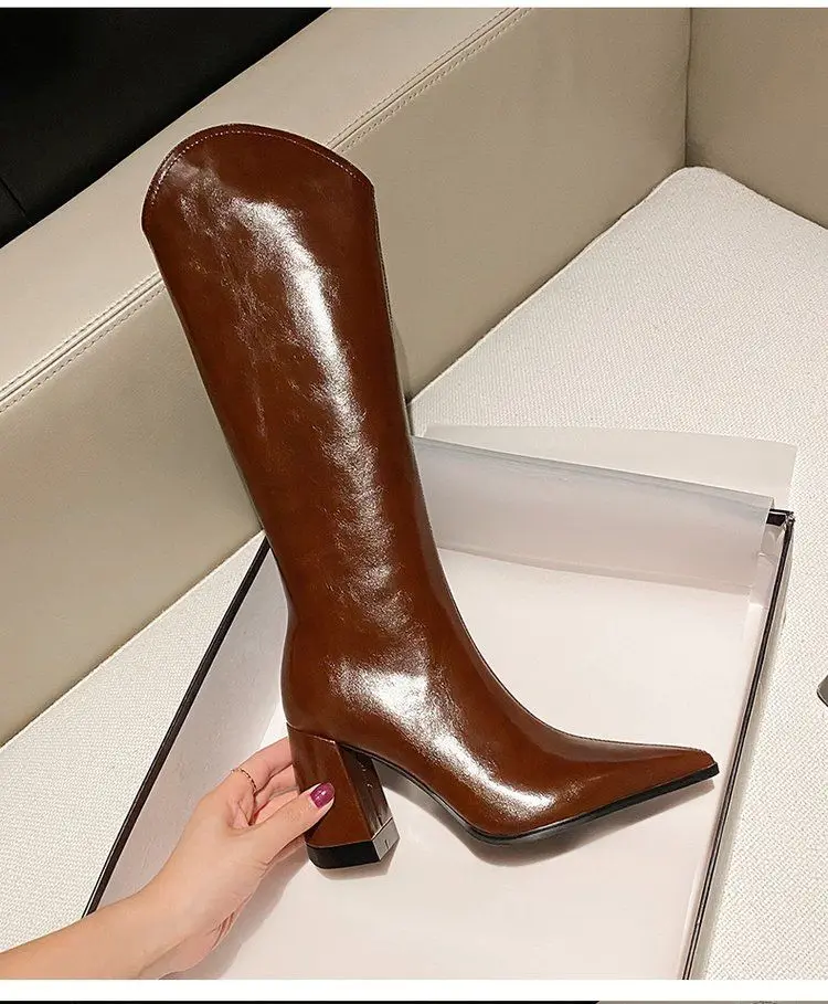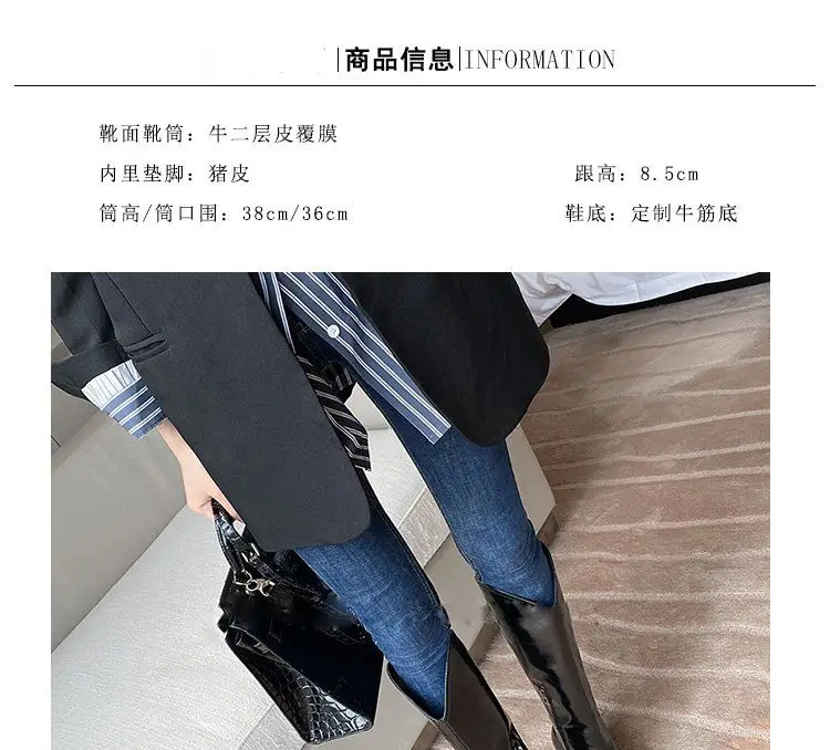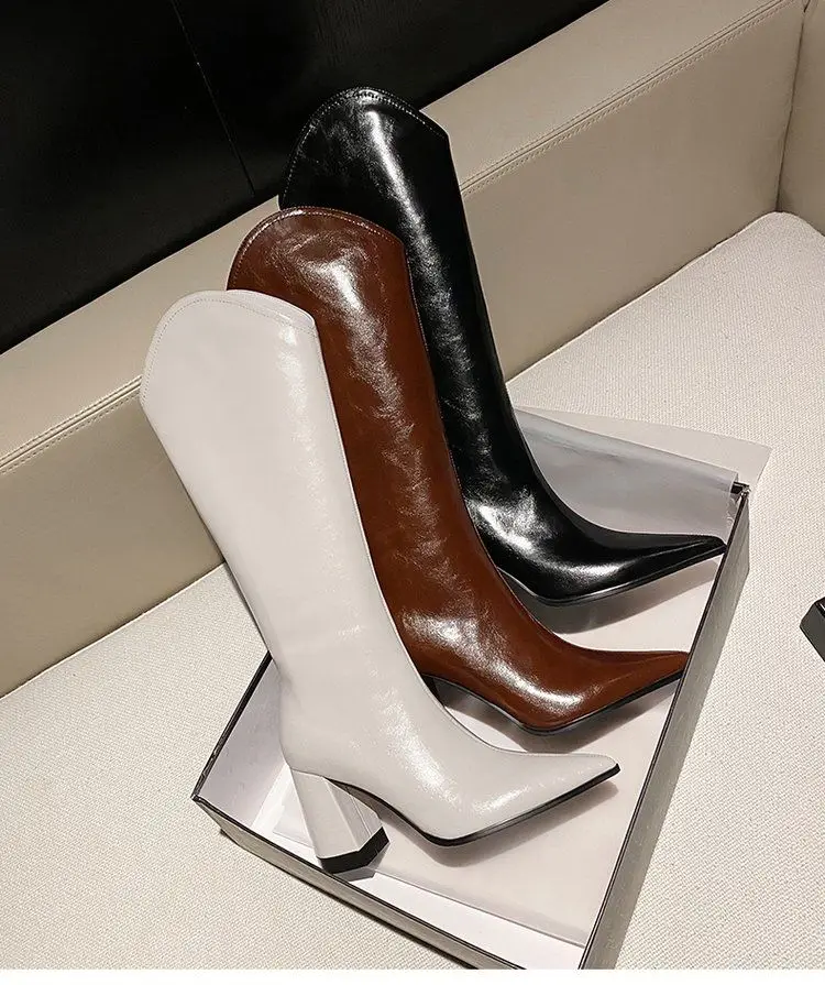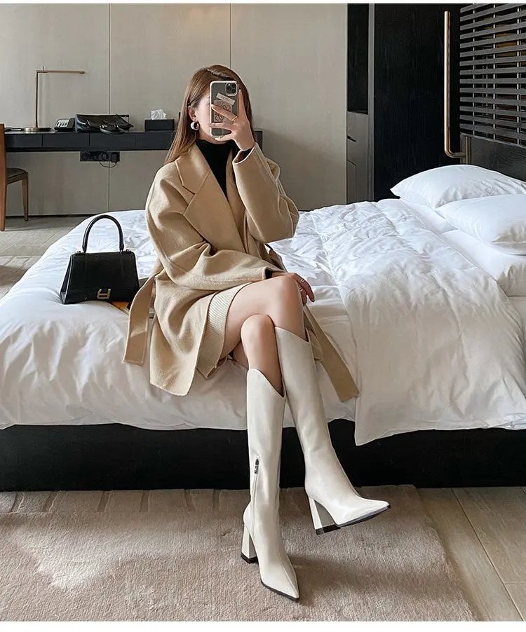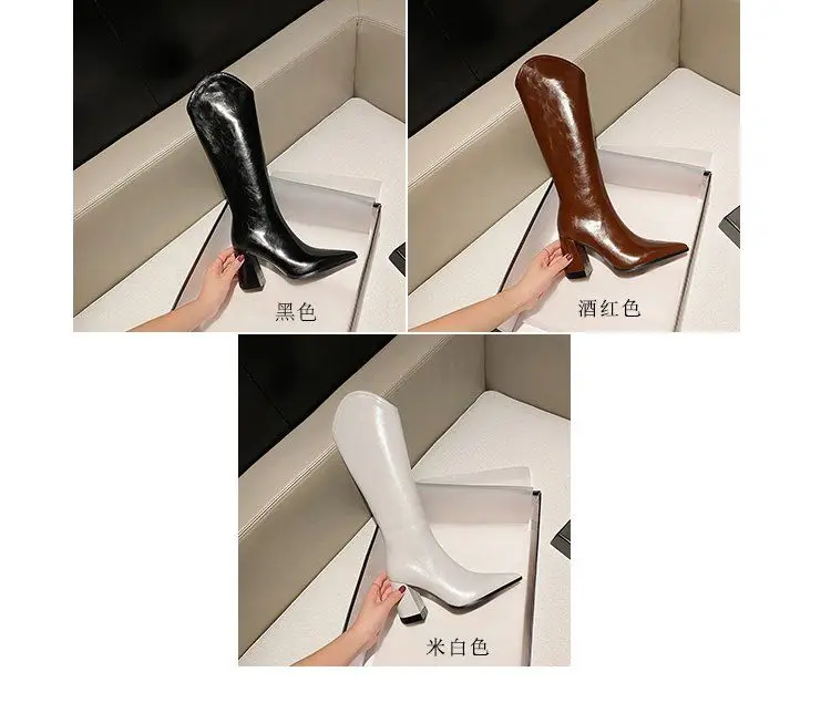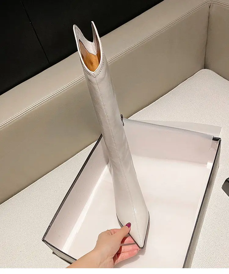 Женские ковбойские сапоги на танкетке, бежевые сапоги до колена на высоком каблуке, с острым носком, для верховой езды, осень 2021