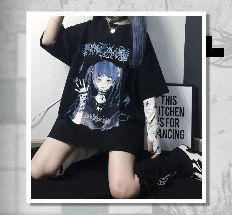 Женский топ с коротким рукавом, свободный черный топ в стиле хип-хоп, в готическом стиле, в стиле Харадзюку, большие размеры, 2021