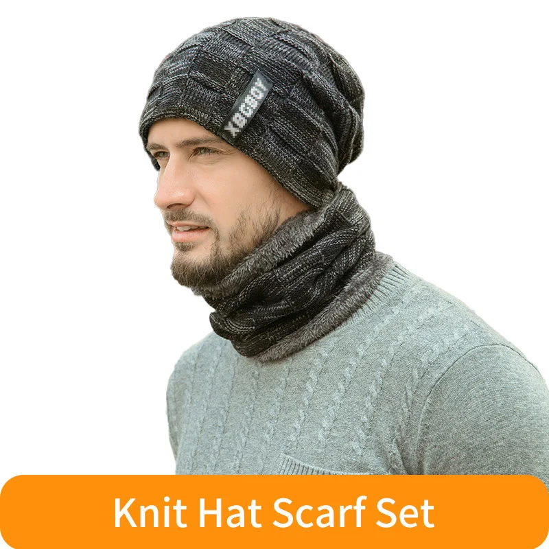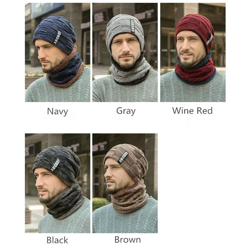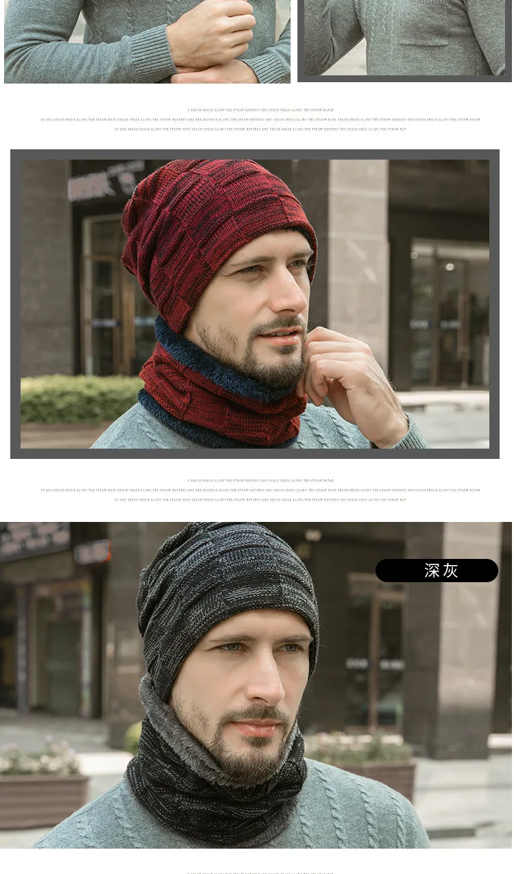 Теплый вязаный комплект с шапкой и шарфом, толстые теплые вязаные шапки-бини с меховой шерстяной подкладкой, Балаклава, зимняя шапка, мужская шапка, повседневный 1 комплект, Новинка