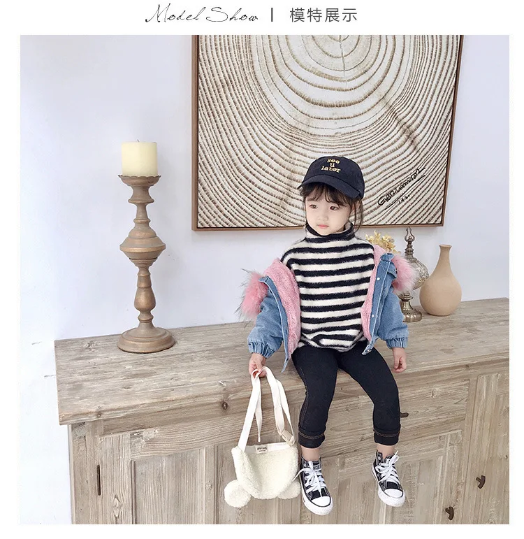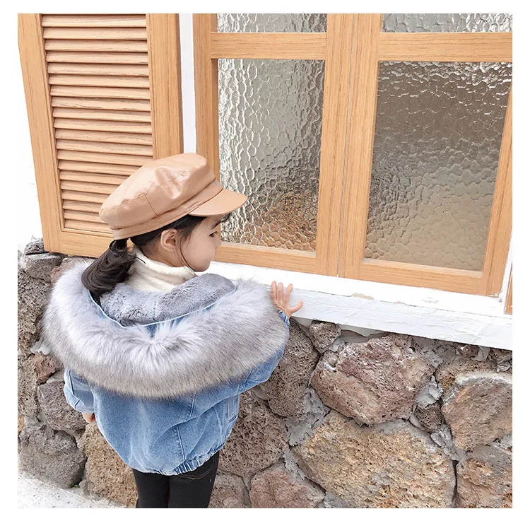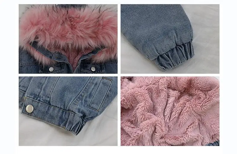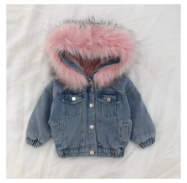 Зимняя модная теплая бархатная детская джинсовая куртка с меховым воротником джинсовые куртки для маленьких девочек Детская верхняя одежда детская одежда