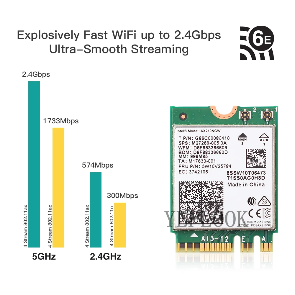 Беспроводная карта Intel AX210 WIFI 6E Bluetooth 5,2Wi-Fi 6 м. 2 AX210 поддерживает 802.11ax MU-MIMO более 2,4 ГГц и 5 ГГц.Максимальная пропускная способность при поддержке Wi-Fi 6 AX210 является скорейшее 2,4 Гбит/с (160 МГц)AX210NGW поддерживает Bluetooth 5,2AX210 может обеспечить гигабитную скорость загрузки и значительно улучшить ваш опыт подключения дома, работы или на ходу.