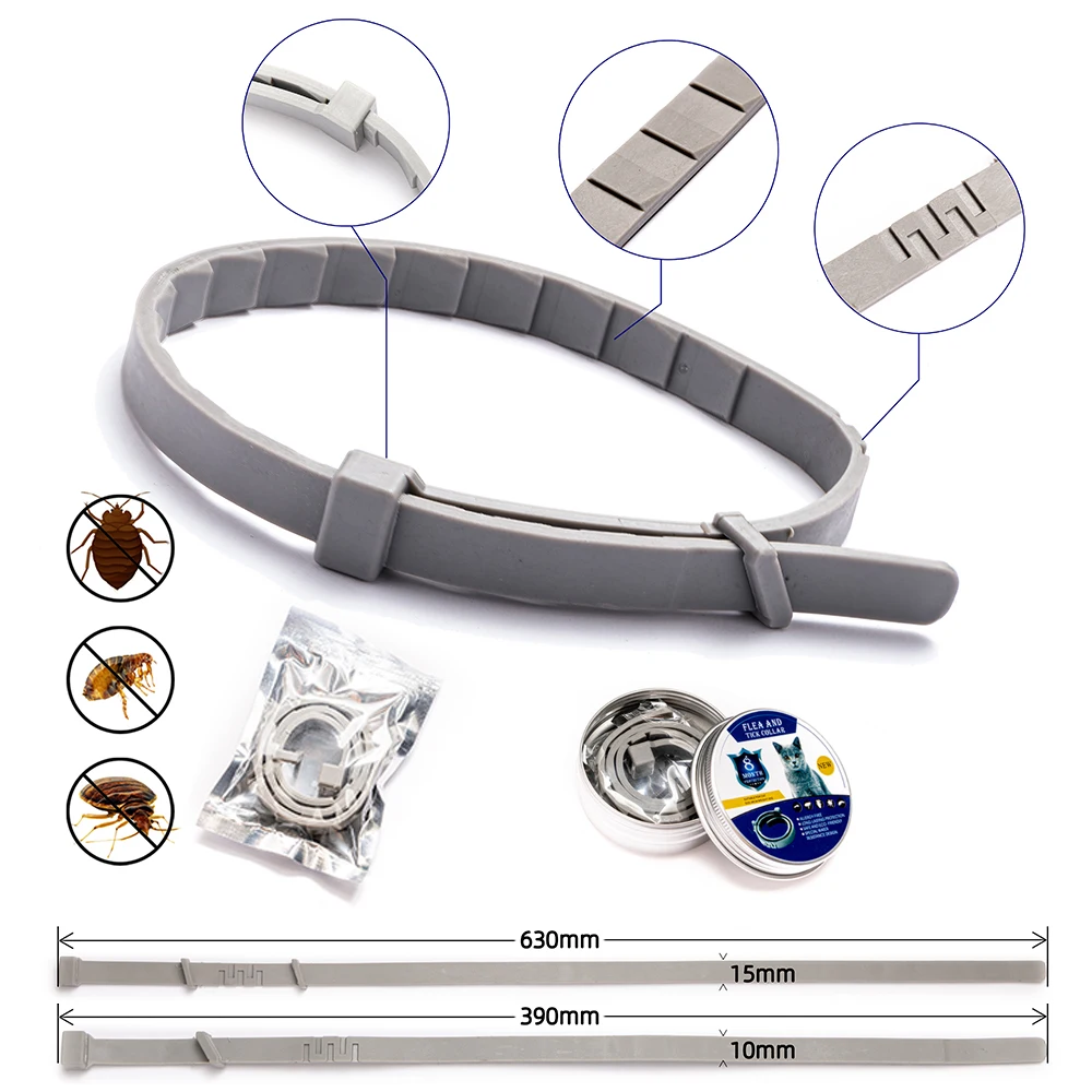 Характеристика:1. Блошиный Воротник работает круглосуточно, чтобы помочь вашему любимому пушистому другу избавиться от внутренних и внешних блох, клещей, личинок и вшей. Защита может длиться до 6-8 месяцев.2. Воротник полностью регулируется, и вы можете отрезать воротник, чтобы отрегулировать его до нужной длины для ваших питомцев.3. Блошиный воротник добавляет водонепроницаемый дизайн и аварийную точку разрыва, которая позволяет вашей маленькой Собаке ходить и играть в дождь или мокрый снег, не беспокоясь об их безопасности и эффективности воротника.4. Если используется шампунь с контролем вредителей, подождите несколько дней, чтобы положить воротник обратно.5. Воротник необходимо носить свободно, чтобы обеспечить рост питомца и позволить воротнику перемещаться по шее, но воротник не должен быть слишком свободным, чтобы его можно было укусить или жевать при ношении питомца.6. Блошиные и клещевые ошейники используются для собак кошек и щенков 8 недель и старше.Спецификация:Размер воротника: 39 см/15,35 дюйма 63 см/24,8 дюймаЦвет: серыйМатериал: резинаТеплые советы:Этот продукт может использоваться собаками и кошками. Перед размещением заказа измерьте окружность шеи вашего питомца. Если обхват шеи меньше 39 см, пожалуйста, выберите воротник 39 см. Для окружности шеи 39-60 см, пожалуйста, выберите воротник 63 см