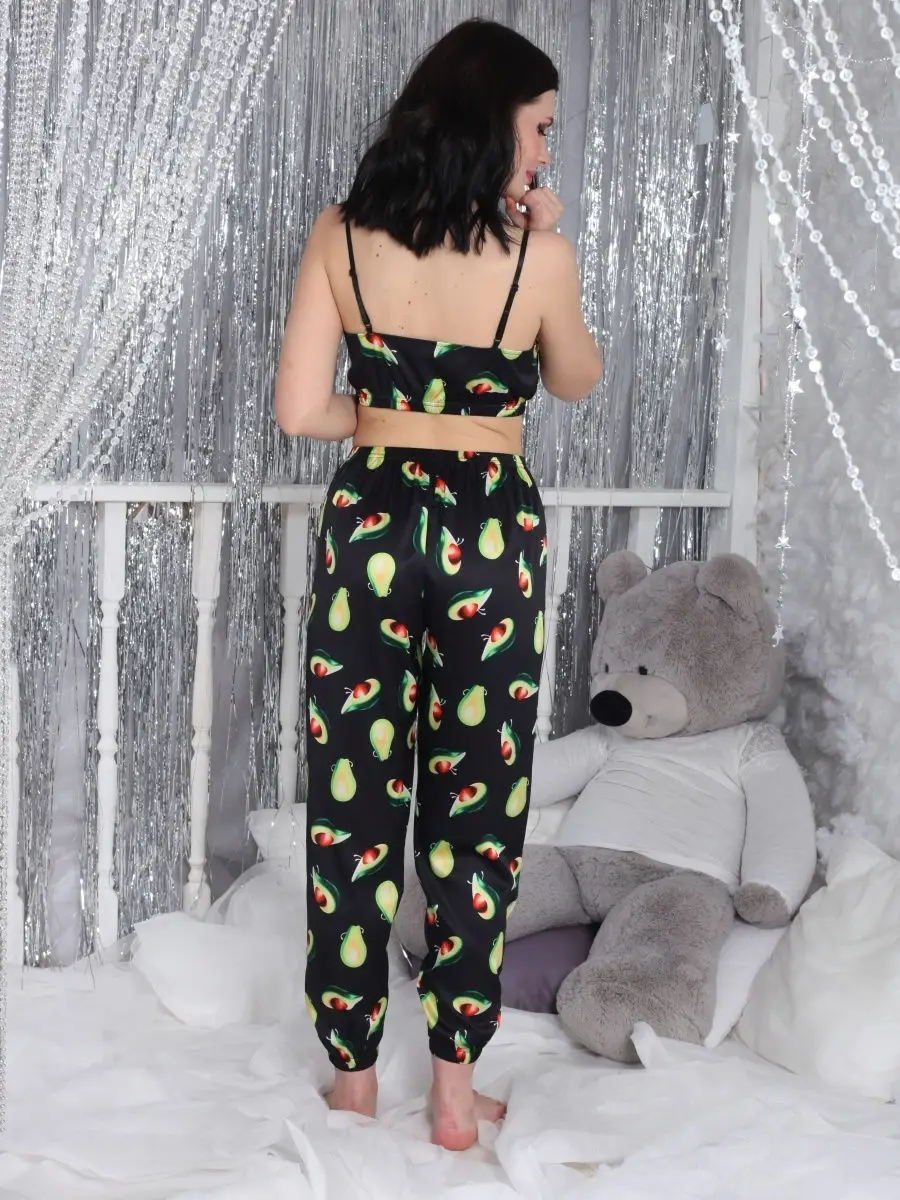 Комплект пижамный женский атласный, модный халатик с принтом авокад...