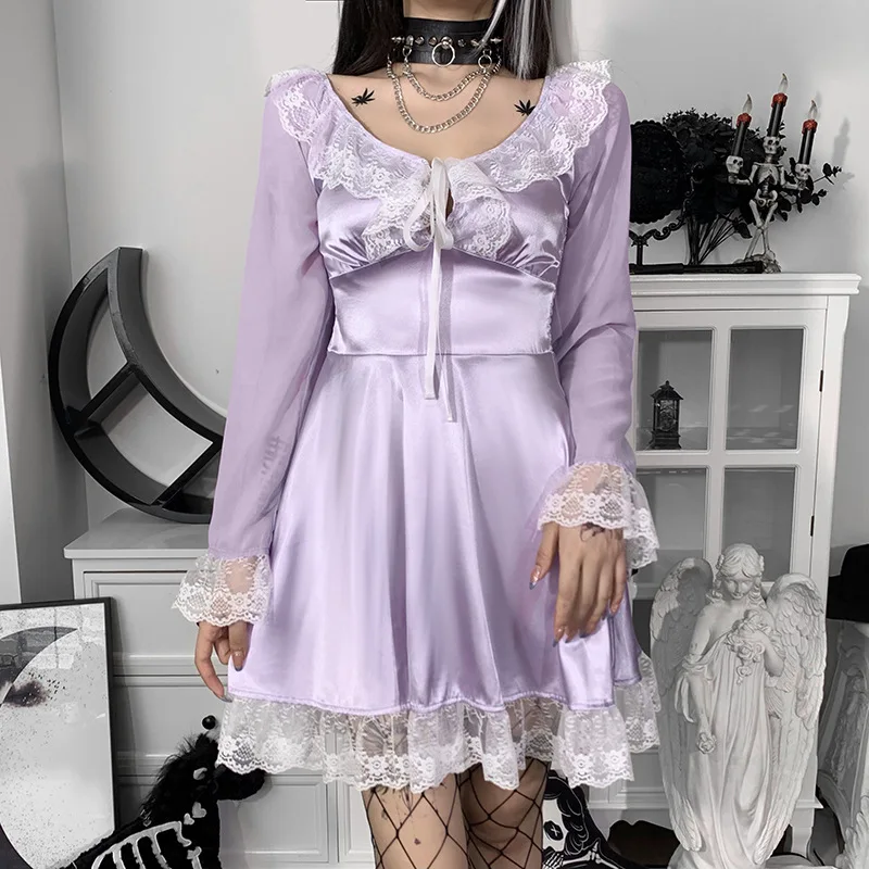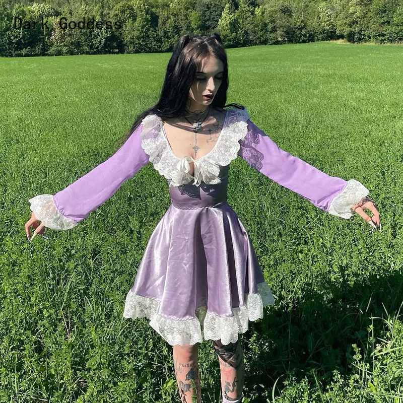 Богемное кружевное мини-платье с квадратным вырезом, обрезанная сексуальная милая Лолита, фиолетовое платье принцессы, женское платье, готическая одежда, новинка