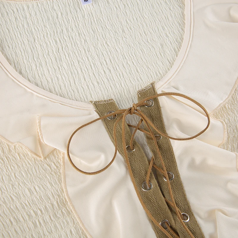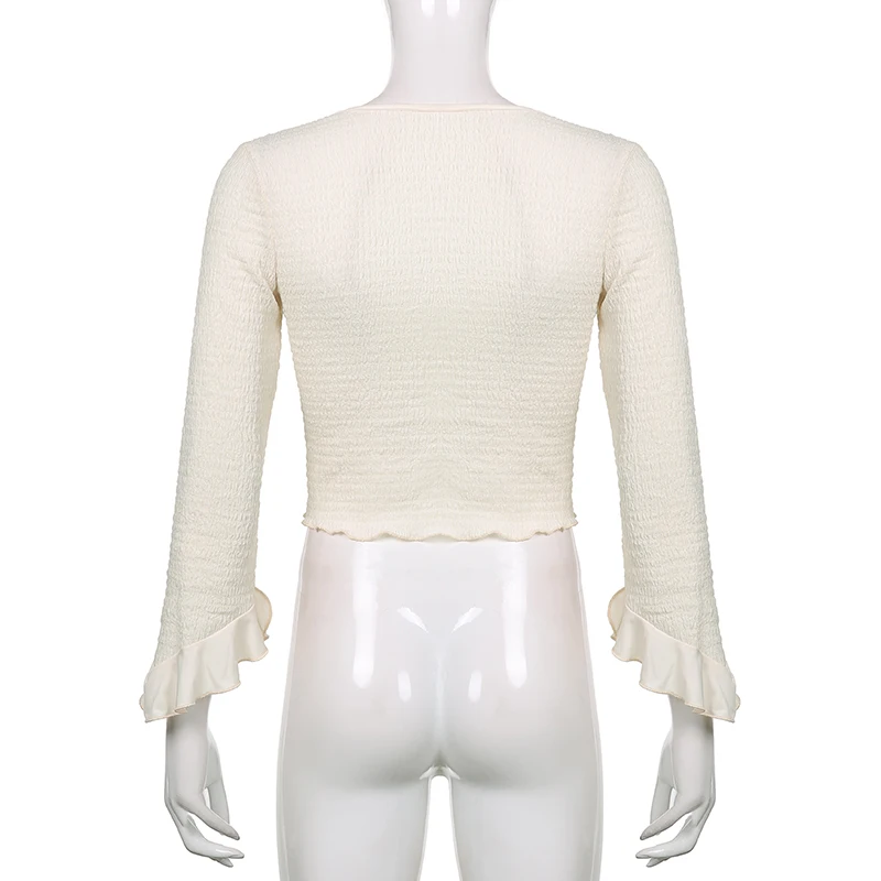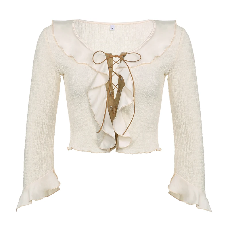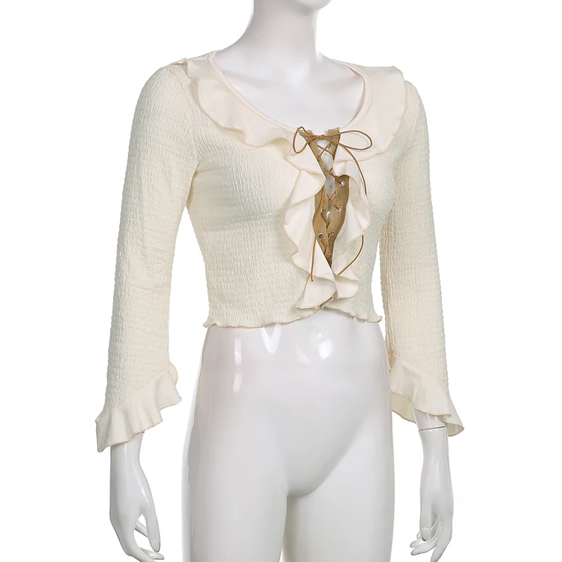 HEYounGIRL, винтажная Элегантная укороченная Футболка с оборками, женская футболка с длинным рукавом и шнуровкой спереди, Модные осенние футболки с V-образным вырезом
