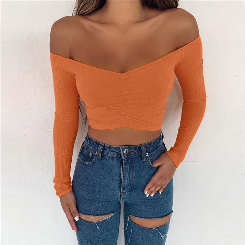 Футболка женская однотонная с длинным рукавом, Модный пикантный клубный топ с открытыми плечами, базовая одежда, на осень