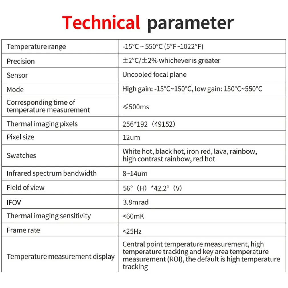 1. С инфракрасными и видимыми световыми линзами Диапазон измерения температуры составляет-15 ℃ ~ 550 ℃/(5 "F ~ 1022 °F) для удовлетворения большего количества потребностей в измерениях.