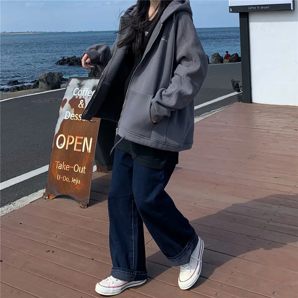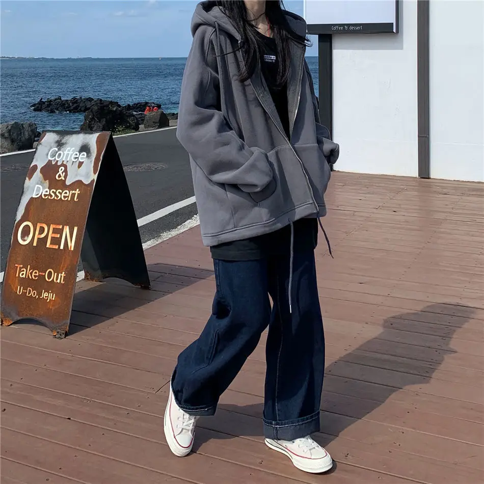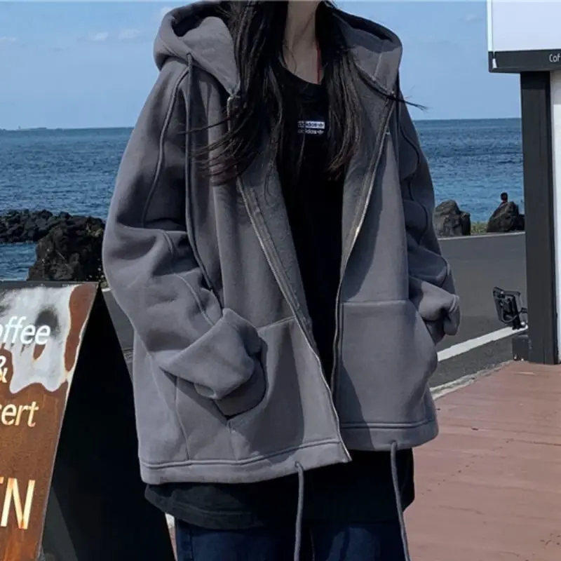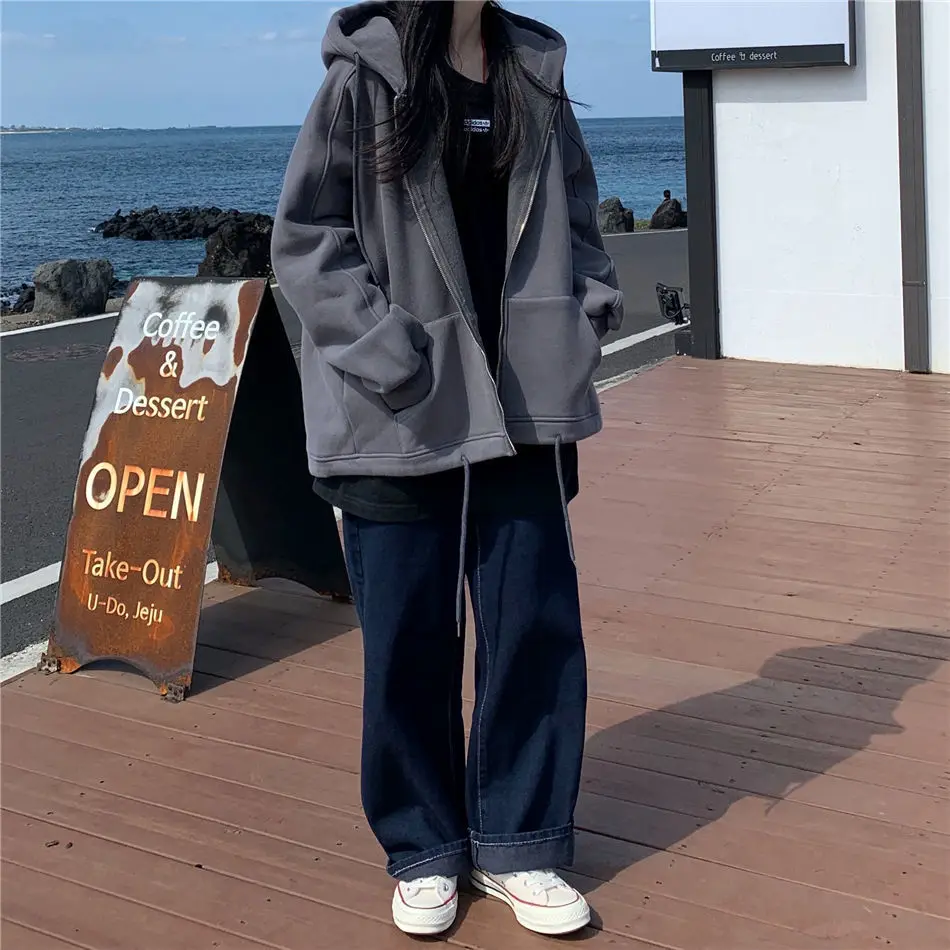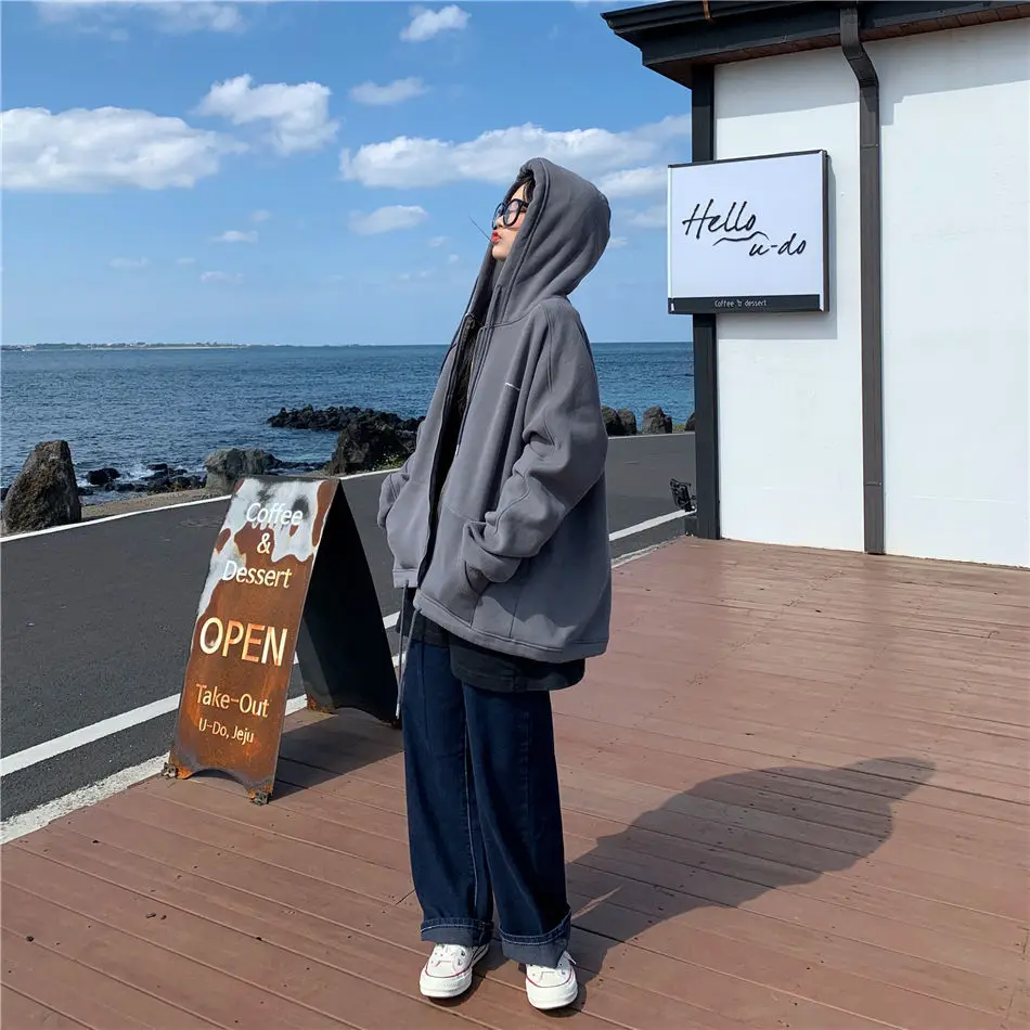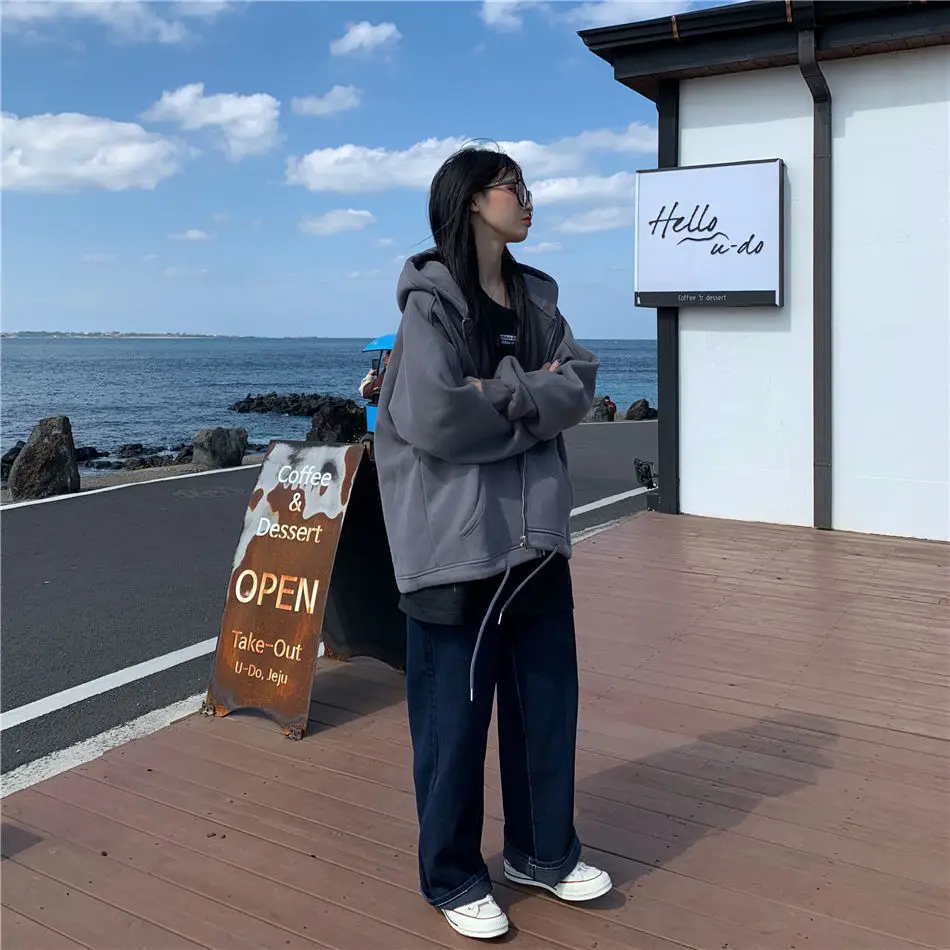 Серая Женская толстовка на молнии в Корейском стиле Harajuku осенне-зимняя теплая Толстовка Оверсайз Повседневная винтажная толстовка на молнии с капюшоном