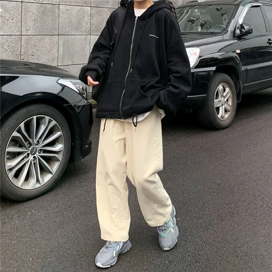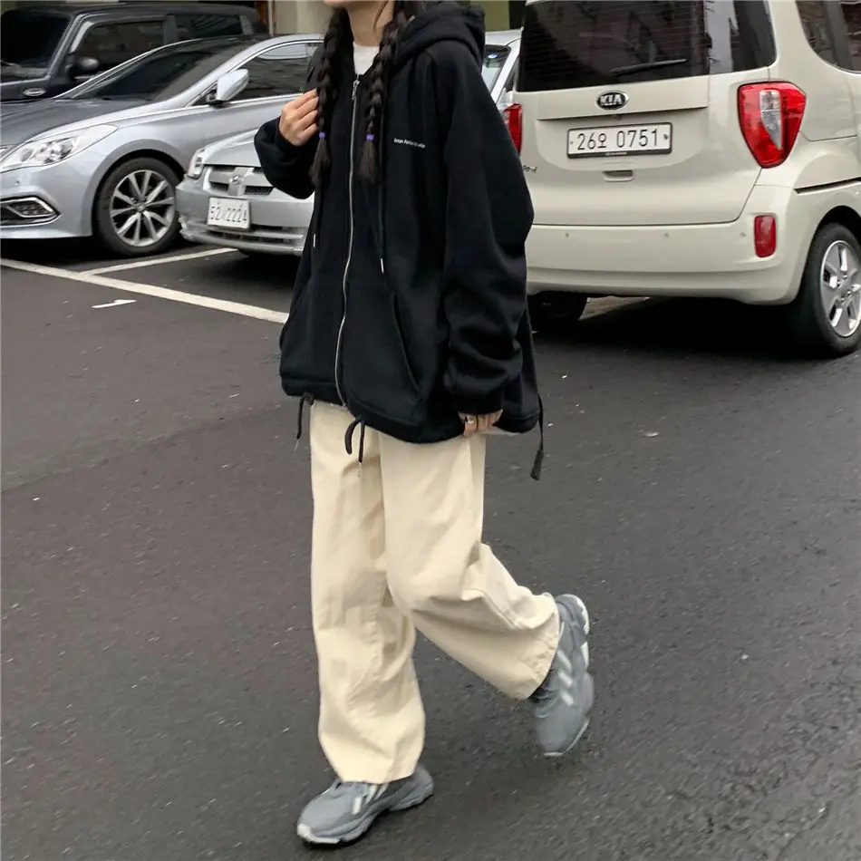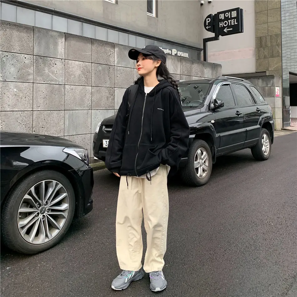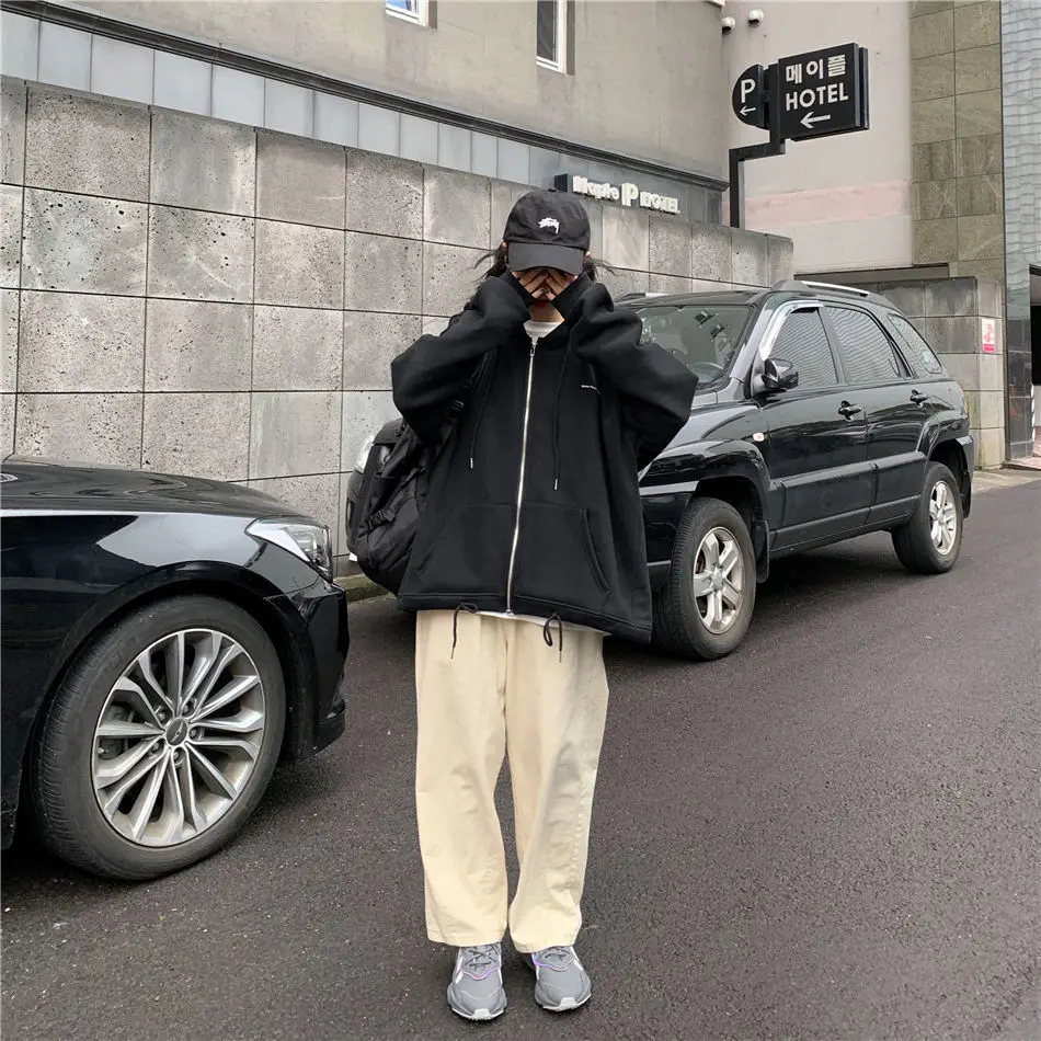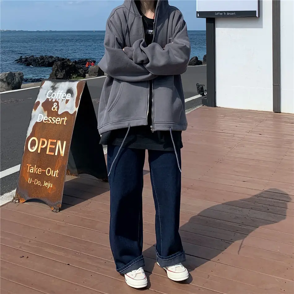 Серая Женская толстовка на молнии в Корейском стиле Harajuku осенне-зимняя теплая Толстовка Оверсайз Повседневная винтажная толстовка на молнии с капюшоном