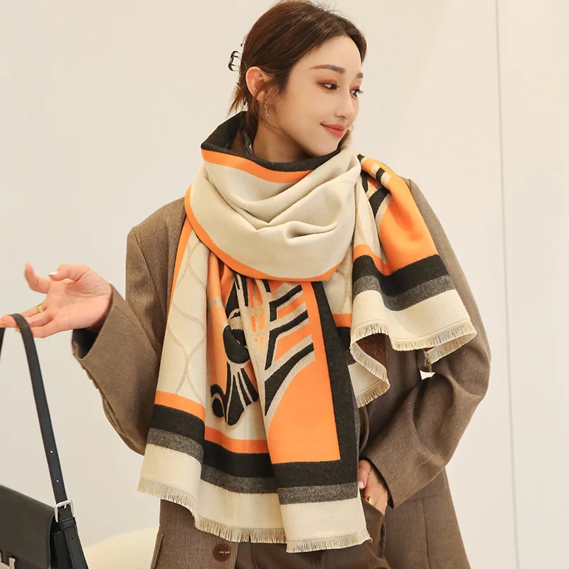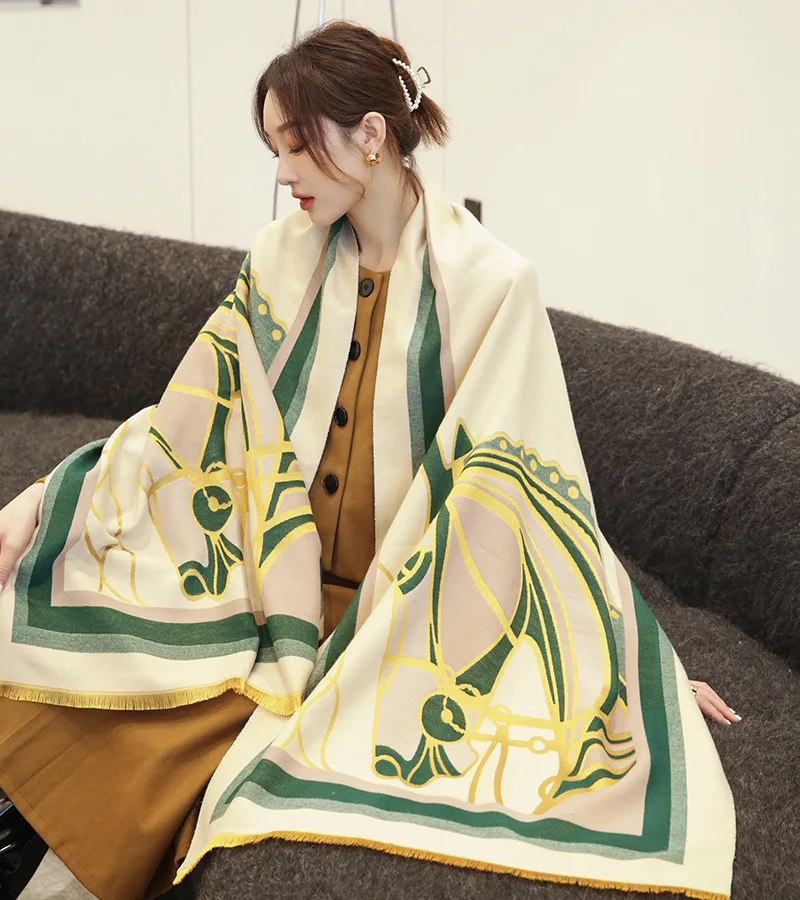 Шарф женский кашемировый, зимний, толстый, с принтом лошадей