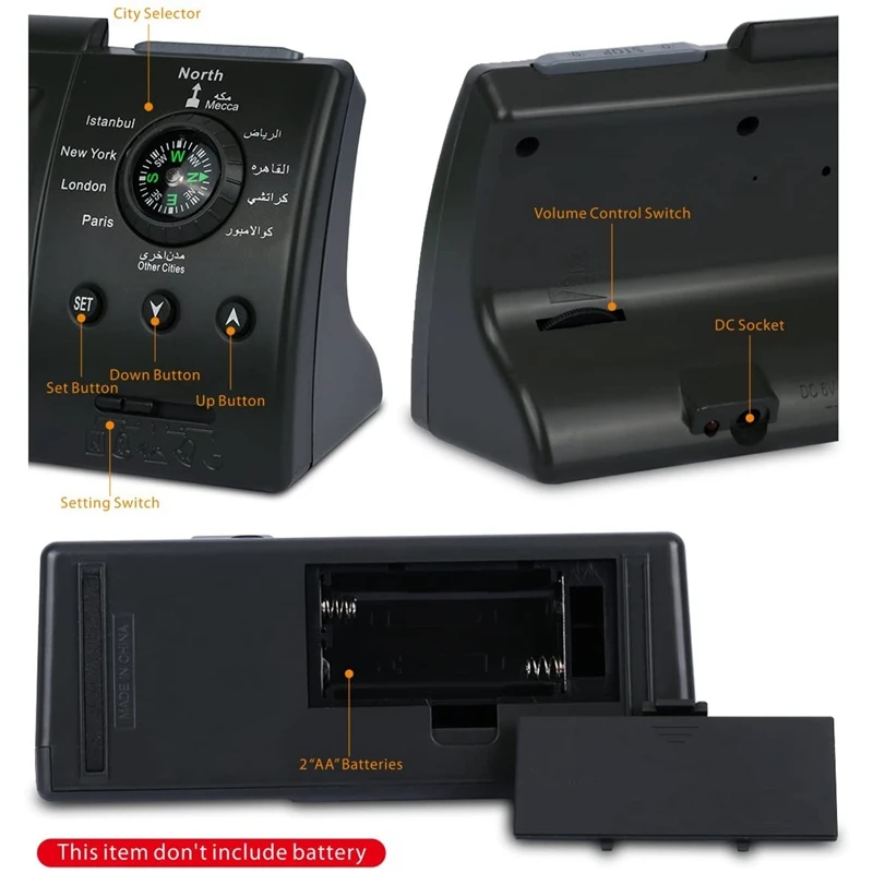 Заполните azan для всех молитв (с регулятором громкости). Время молитвы для большинства городов по всему миру. Направление Qibla (по отношению к северу). Хиджри и григорианские календари. Календарь хиджри следует за григорианской датой и основан на астрономической Луне, видимой в Мекке. Заполните azan для всех молитв. Характерные часы с высоким качеством azan звук для всех молитв с azan регулятор громкости установлены во всех моделях часов. Шесть систем taqweem запрограммированы в часахАвтоматическая сигнализация fajr pray: Эта уникальная функция позволяет вам просыпаться каждый день точно в то же время относительно Fajr azan. Например, предположим, что вы настроили будильник на 5:15 AM и Fajr azan на 5:05 AM. На следующий день, если Fajr azan станет 5:06 AM, то автоматически этот будильник изменится на 5:16 AM. В этот чехол, вы будете просыпаться через 10 минут после Fajr цифровых часов на открытом воздухе на каждый день.Ежедневная Сигнализация: будильник для работы и школы; Ежедневная сигнализация-это обычная сигнализация, которая звонит одновременно каждый день. Кроме того, этот будильник может быть установлен, чтобы не звонить в выходные дни. Звук Crescendo: все сигналы тревоги имеют слабый звук пробуждения, который постепенно увеличивается. Один раз будильник: в дополнение к Fajr и ежедневным будильникам, часы включают дополнительный будильник (называется будильником 1 день). Можно установить кольцо для специальных встреч.Отображение температуры-Отображение температуры в градусах Цельсия (с). Опция повтора; Полноэкранный светильник El; Аудиовыход (подключение к динамику); Внешний вход постоянного тока 6 Вольт 300 мА; Дневной светильник с возможностью экономии времени (для стран, использующих эту систему); напоминание о нежных молитвах (когда звук azan выключен); Может легко изменить время молитвы на окраины городовИспользует местную taqweem или наиболее широко используемую систему taqweem для вашего города. Другие стандартные системы taqweem доступны следующим образом:(DF) Local taqweenСаудовская Аравия таквеем ум аль-КураСтраны Персидского залива и Аравийский полуостровJordan и Palestine: Jordan taqweenЕгипет и другие арабские страны: египетская taqweenСеверная Америка: ИСЛАМСКОЕ ОБЩЕСТВО Северной Америки (ISNA)Индийский субконтинент: Исламский университетЕвропа и другие страны Исламская Всемирная организация(H) Выбор метода Hanafi для ASR18,17 мусульманская мировая Лига (мусульманская лига)19:17 Египетский таквеем (Египет)18: 18 Исламский университет в Карачи (Hanafi taqweem)15:15 союз ИСЛАМСКОЕ ОБЩЕСТВО Северной Америки (ISNA)1:30 фиксированное время, Fajr время определяется как фиксированный интервал времени до времени shrooq. Время Isha определяется как фиксированный интервал времени после Magrib azan. Эта система используется в Северной Европе.ДатаФаджр азанБудильник к утренней молитве1 мая5:05 AM5:15 AM2 мая5:06 AM5:16 AM автоматически изменяется на 5:16Цвет: Золотой/черныйМатериал: АБС-пластикРазмер: 15x6x8,5 смПосылка:Часы azan-1 шт.Примечание: без аккумулятораТолько вышеуказанная посылка, другие товары не включены.Примечание: светильник и различные дисплеи могут привести к тому, что цвет товара на картинке немного отличается от реального. Допускается погрешность в измерениях +/- 1-3 см.