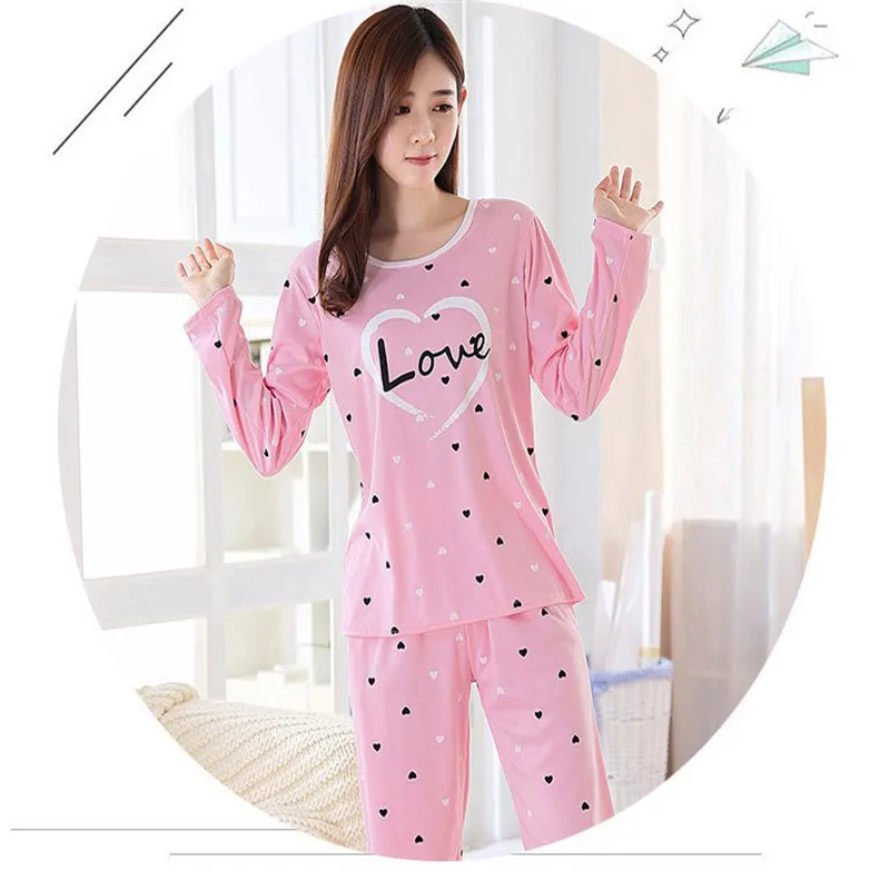 Женский пижамный комплект, с длинным рукавом и мультяшным принтом сердца, пижама с круглым вырезом + штаны для сна, Осень-зима