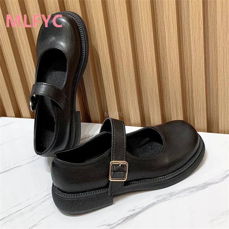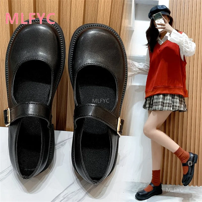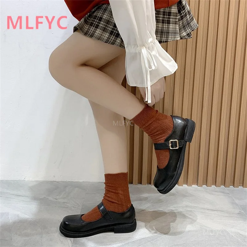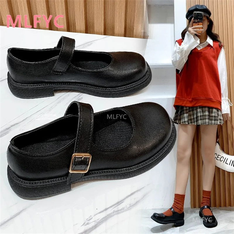 Новинка Осень 2021, маленькие кожаные туфли с круглым носком, ретро туфли на среднем каблуке, с пряжкой, на толстом каблуке, женские Туфли Мэри Джейн
