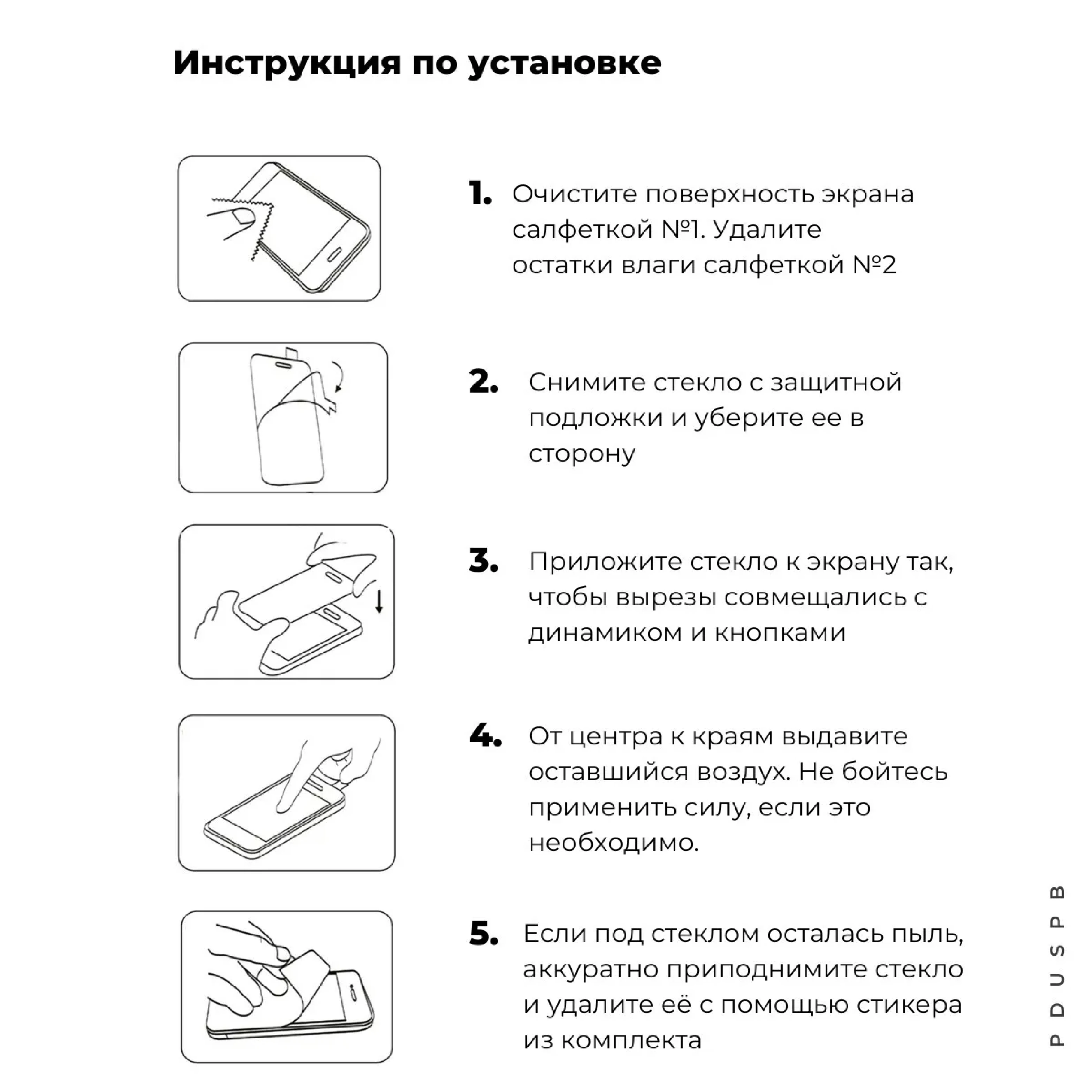 5. Осторожно нажмите на центр стекла. Благодаря клейким свойствам он легко устанавливается на дисплей. Небольшие пузырьки воздуха исчезнут через несколько минут. Если воздух не уходит, плавные движения по стеклу должны приводить его к краю.Уважаемые покупатели! Обязательно проверьте стекло на соответствие после получения. При выявлении брака сделайте возврат с отметкой «Брак»: таким образом, бракованный товар не будет доставлен другому покупателю.В комплекте: защитное стекло, сухая ткань из микрофибры, влажная ткань для обезжиривания и наклейки для удаления пыли.