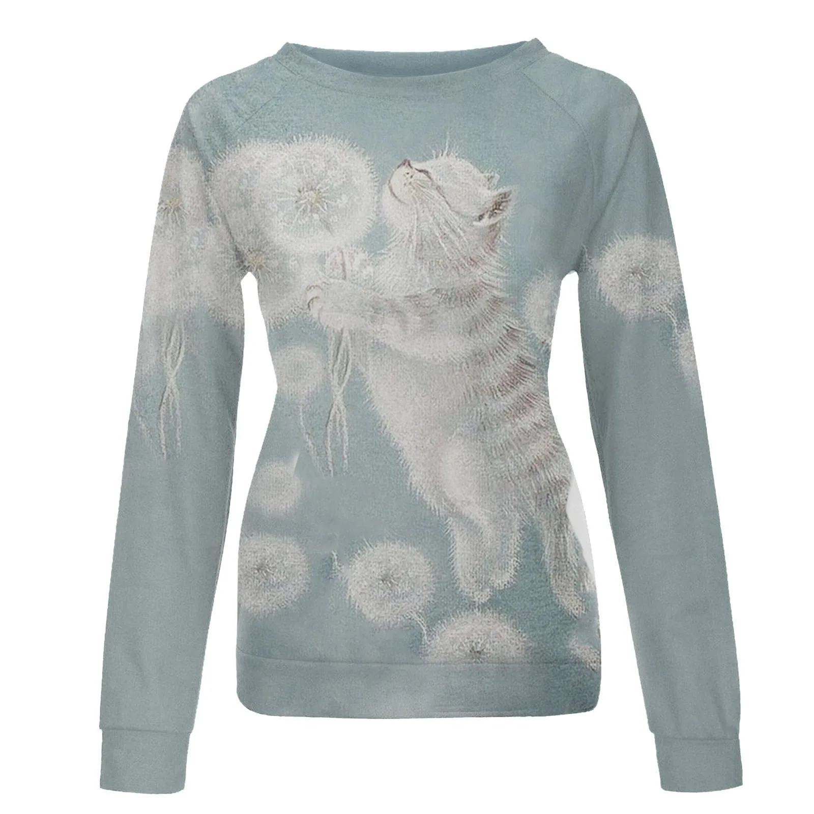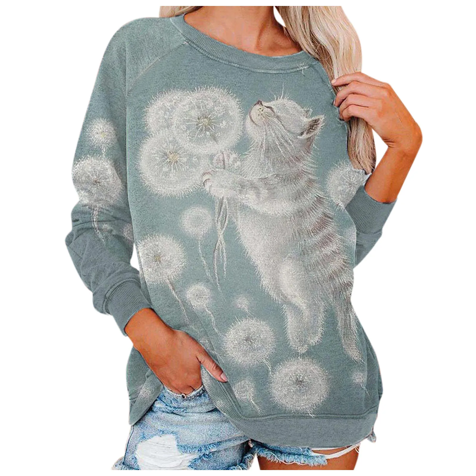 Толстовка Женская Harajuku, с изображением кота и одуванчиков, свободная, с круглым вырезом