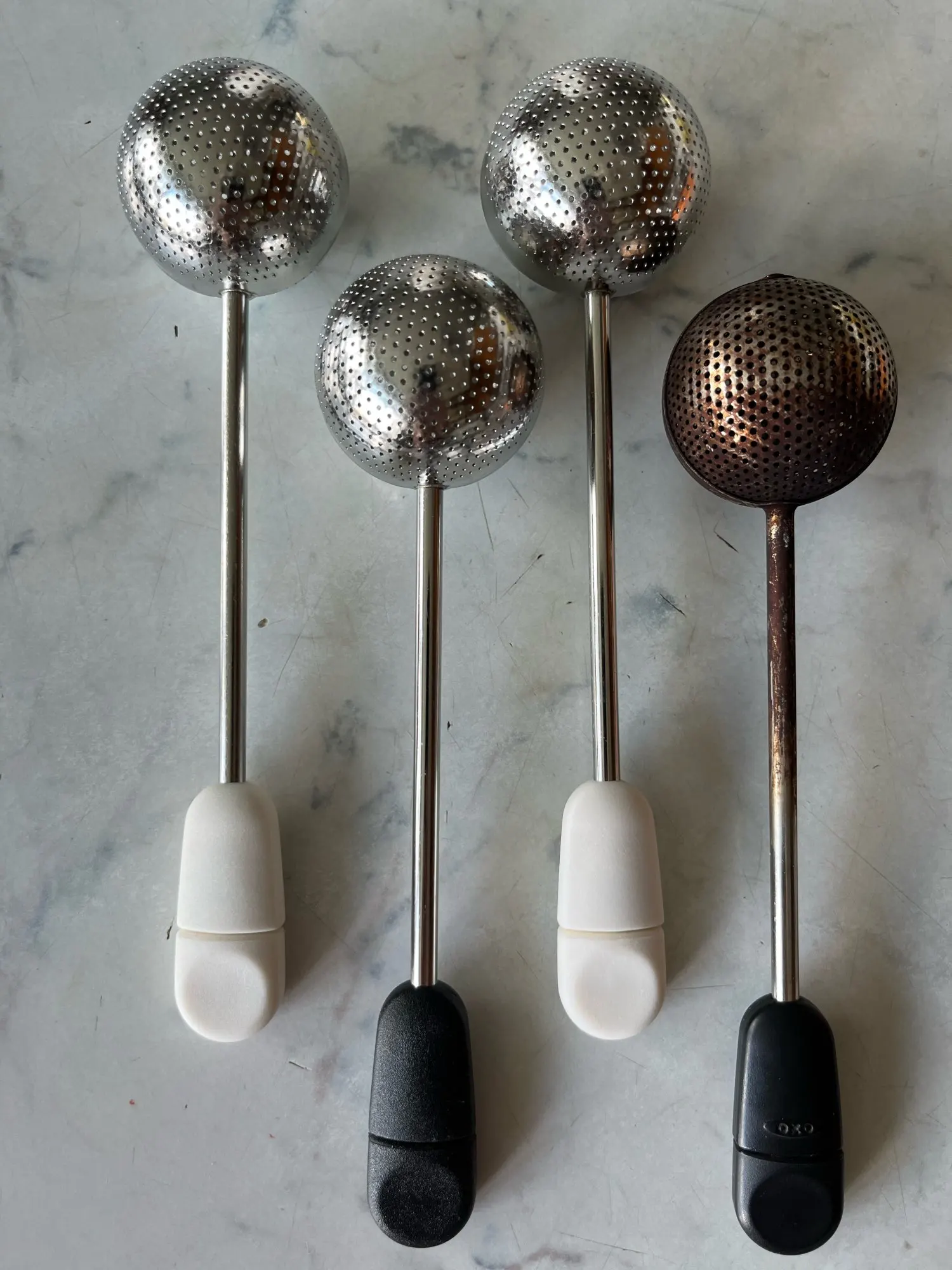 Заказал 3 ситечка по 171₽ за каждое, четвёртое на фото - моё старое ситечко от OXO, которое покупал лет 7-8 назад за 1400₽. Чуточку другой пластик и потуже крутится, но функциональность такая же) Эти даже надёжнее защёлкиваются.