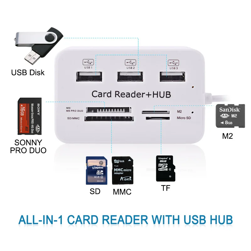 Многофункциональность: 3 порта USB 2,0 концентратор + кардридер для MS/MS PRO DUO, SD/MMC, M2, Micro SD(TF карта)