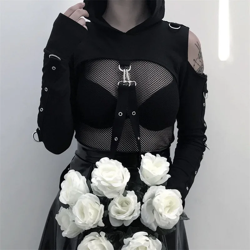 Укороченный полый топ, Женская сетчатая рубашка, Готическая панковс...