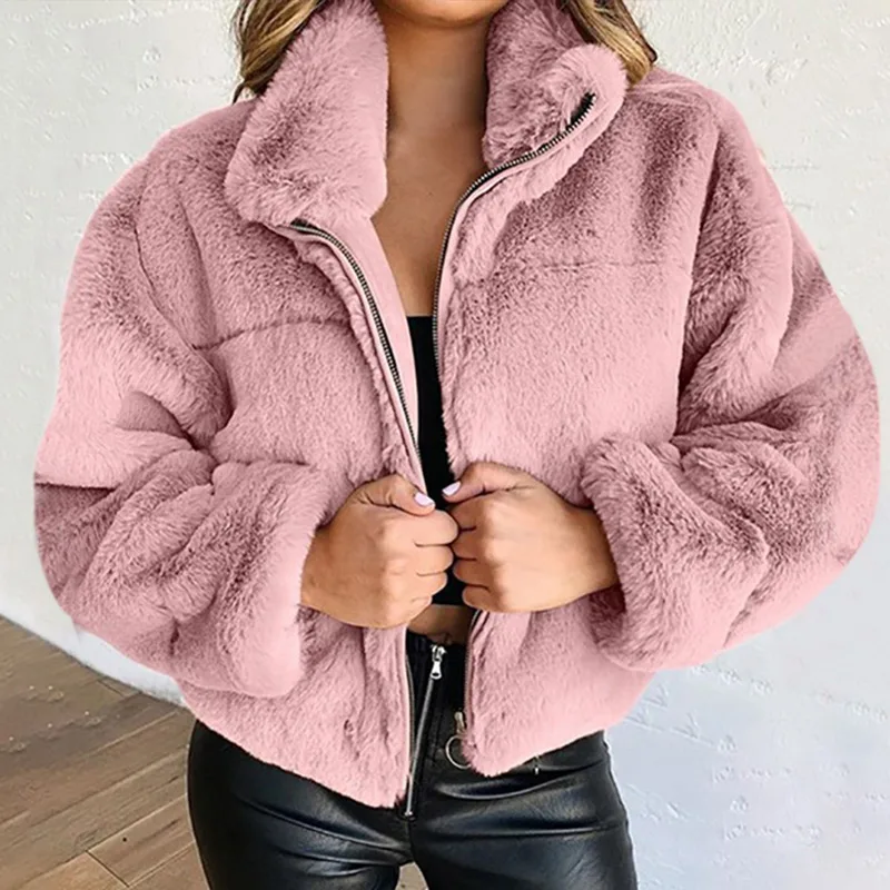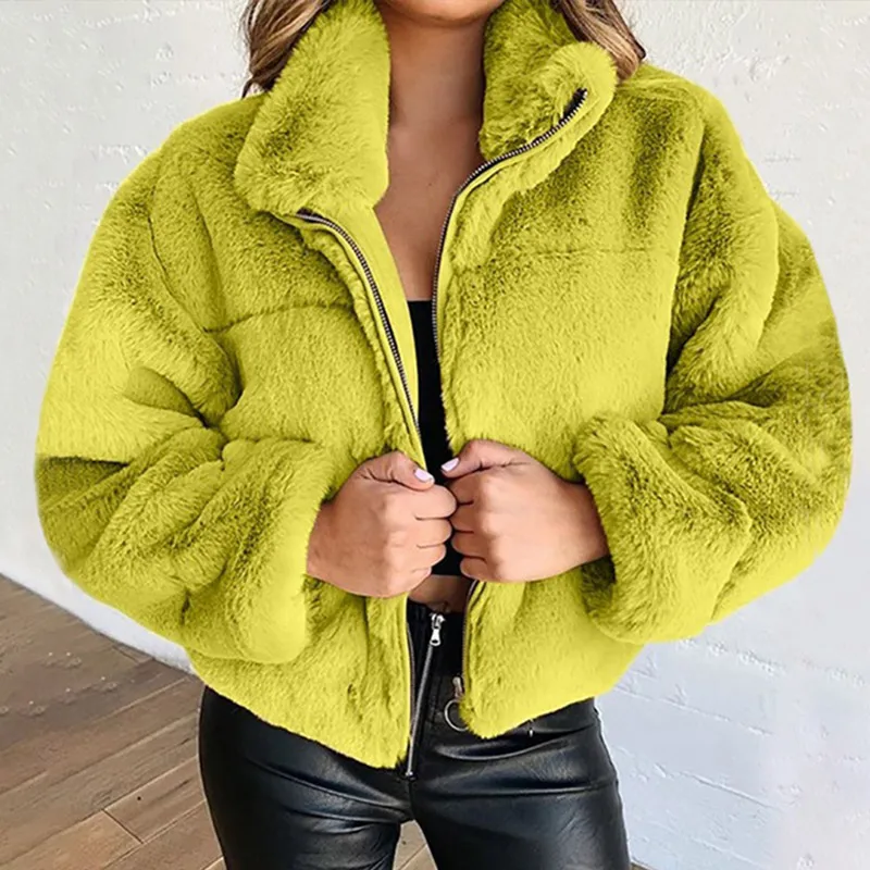 Женская пушистая короткая куртка, модель 2021 года, зимняя модная Утепленная зимняя уличная одежда из искусственного меха, свободная теплая куртка на молнии с отложным воротником