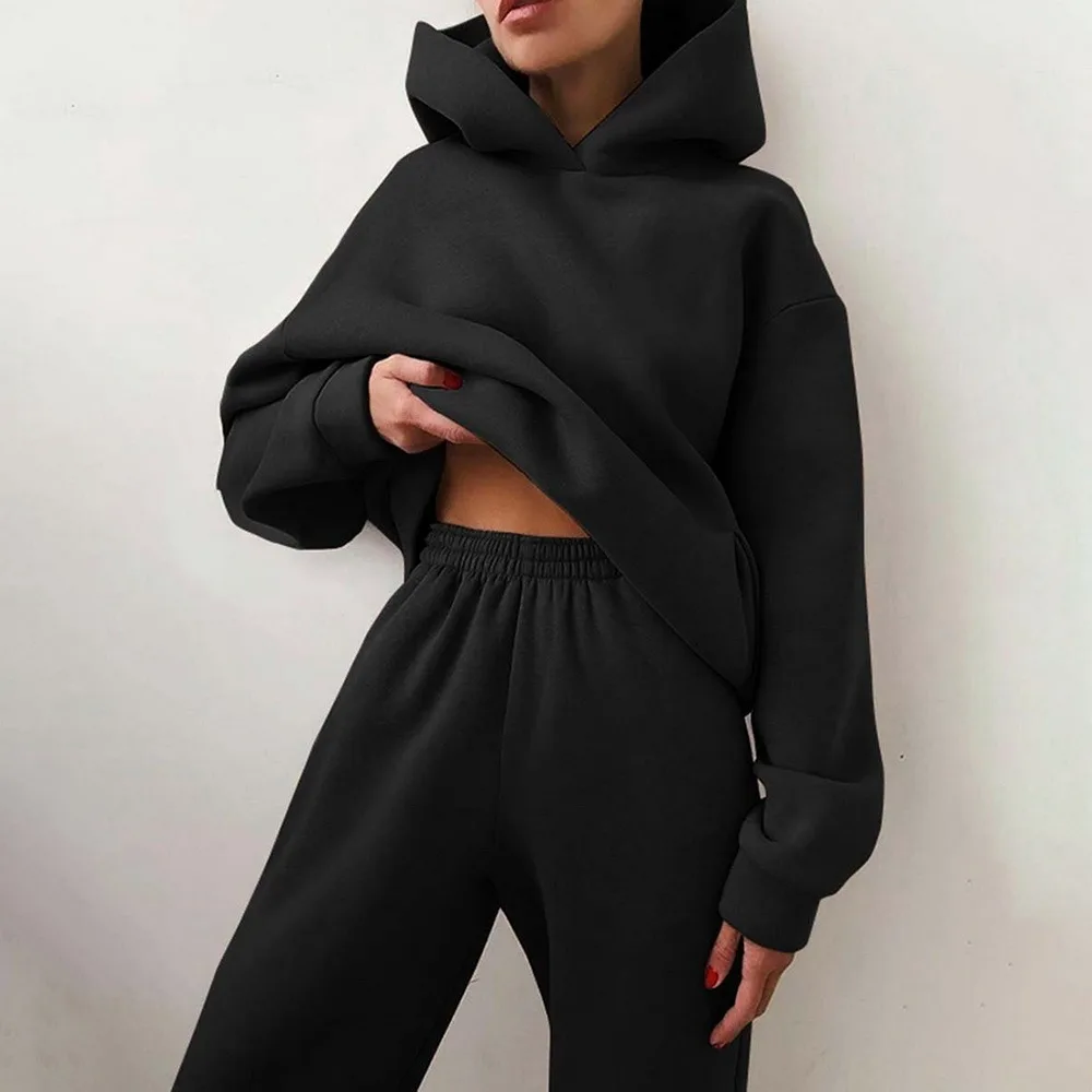 Женский однотонный костюм из 2 предметов, осенне-зимний Повседневный плотный флисовый теплый спортивный костюм, женский свитшот с длинным рукавом и капюшоном, наряд