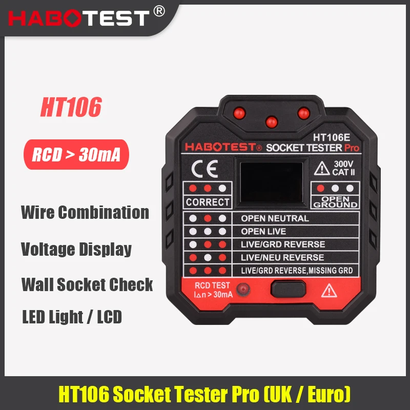 Тестер для розеток HT106, штепсельная Вилка для ЕС, Великобритании, 30 мА, RCD, проверка напряжения, заземляющий нулевой живой провод, штепсельная вилка, проверка фазы полярности