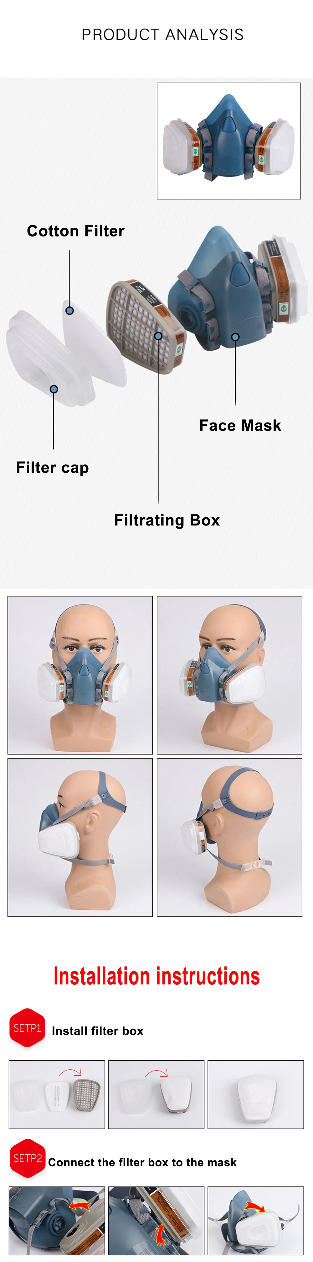 Полулицевая часть многоразового респиратора обеспечивает универсальность для многих сред и приложений, обеспечивая защиту от твердых частиц и широкого спектра газов и паров при использовании с утвержденными картриджами и фильтрами. (Может заменить 3 м 7502) полумаска-средний размер обеспечивает плотное прилегание к лицу любого типа и размера. Система крепления двух эластичных резиновых ремней на хлопке и повязка на голову регулируется в четырех точках. Подложка не вызывает аллергии, мягкая и плотная на лице полоска. Удобный дизайн обеспечивает хороший обзор, Совместимость с защитой глаз и очками на голове, шлемами. Посылка Iist