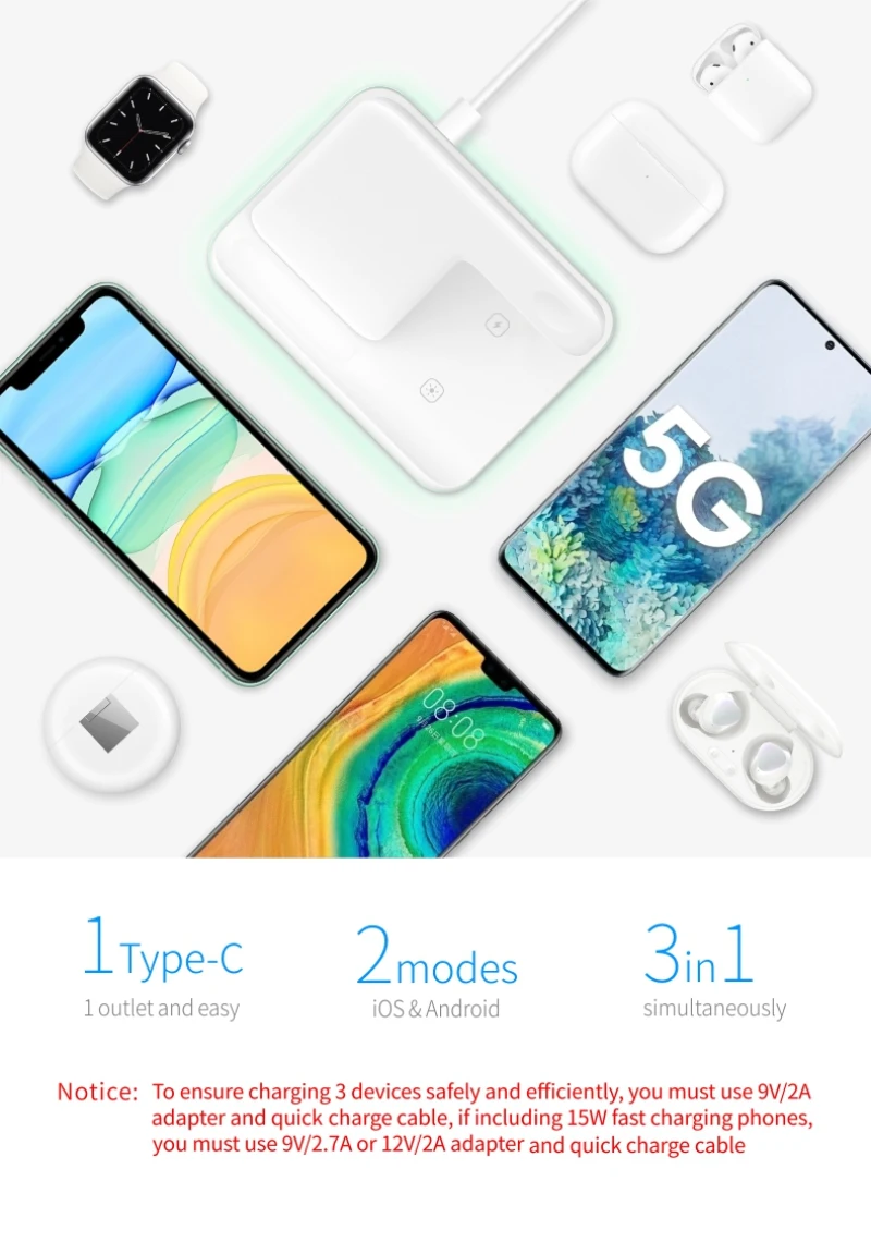 [Широкая совместимость]: выход беспроводного зарядного устройства 5 Вт для Airpods Pro / 2 чехла для беспроводной зарядки и других устройств с поддержкой Qi в качестве настоящих беспроводных наушников; 7,5 Вт быстрой зарядки для продукции apple iPhone 12/12 Pro/12/12 Pro max/SE/2/11/11 Pro / 11 Pro Max / XS MAX / XR / X / 8/8 плюс; Быстрая Беспроводная зарядка 15 Вт для Samsung Galaxy S20, S20, S20 Ultra, S10, S10 Plus, S10E, S9, S9Plus, Note 10, Note 9, Note 8, S8, S8Plus, s7, S7 edge, S6 edge, Note 5; (Примечание: 3 устройства при зарядке, Используйте адаптер 9V-2A QC3.0.) Не входит в комплект
