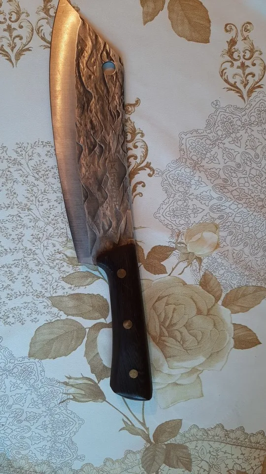 получил нож, нож сделан под кованный, но далеко не кованный, но вес имеет, я думал что в обухе нож будет хотя бы 5-6 миллиметров но нет всего наверное 4 мм, очень острый, но есть проблема сегодня разделывал карася и отрезал хвостовой плавник сразу не заметил но потом увидел заточная кромка просто загнулась, это для кованного ножа не очень хорошо, а так нож нормально, свою функцию выполняет.