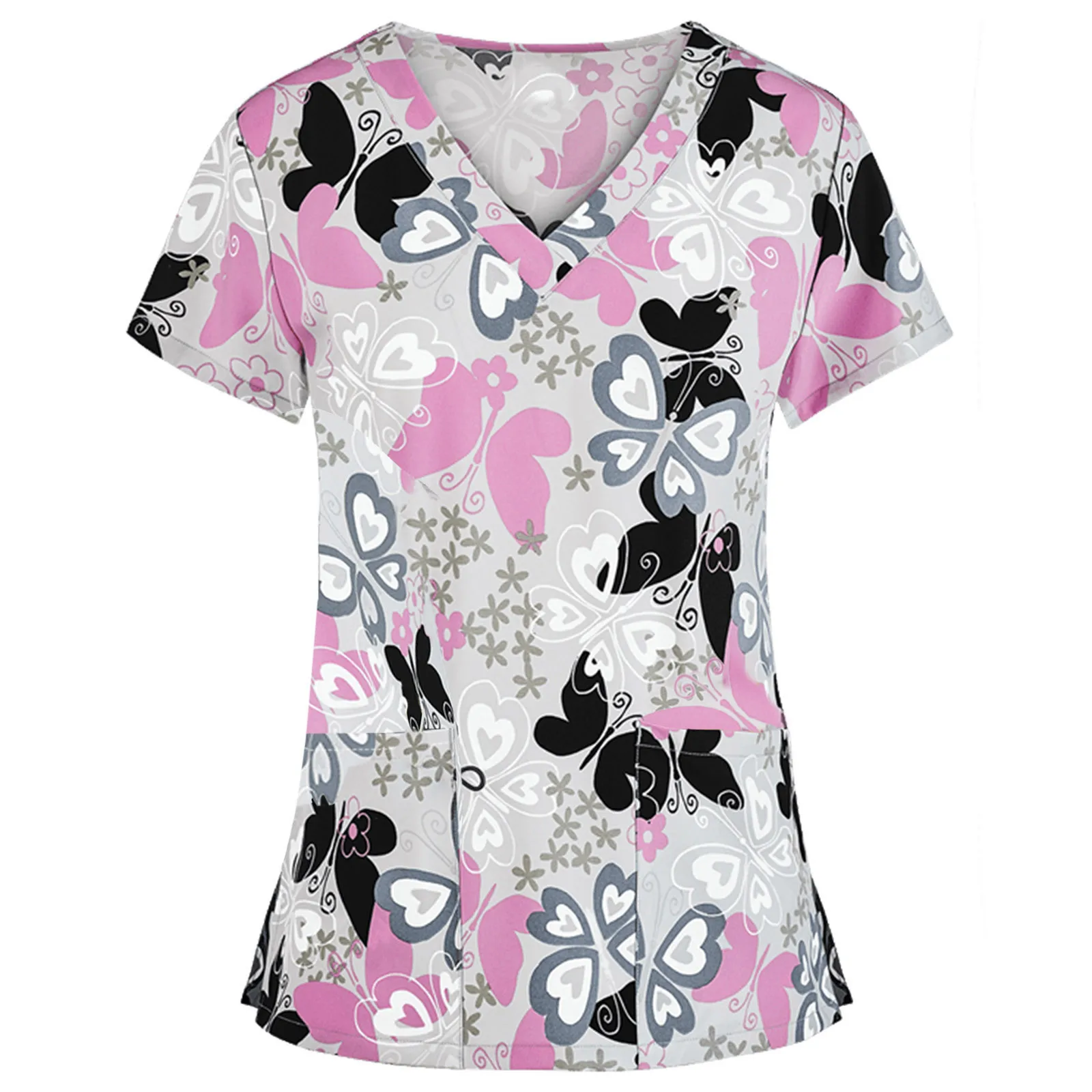 Размера плюс 3xl униформа медсестры с принтом бабочки Скрабы женские топы с коротким рукавом и V-образным вырезом Рабочая Униформа женская одежда медсестры с карманами