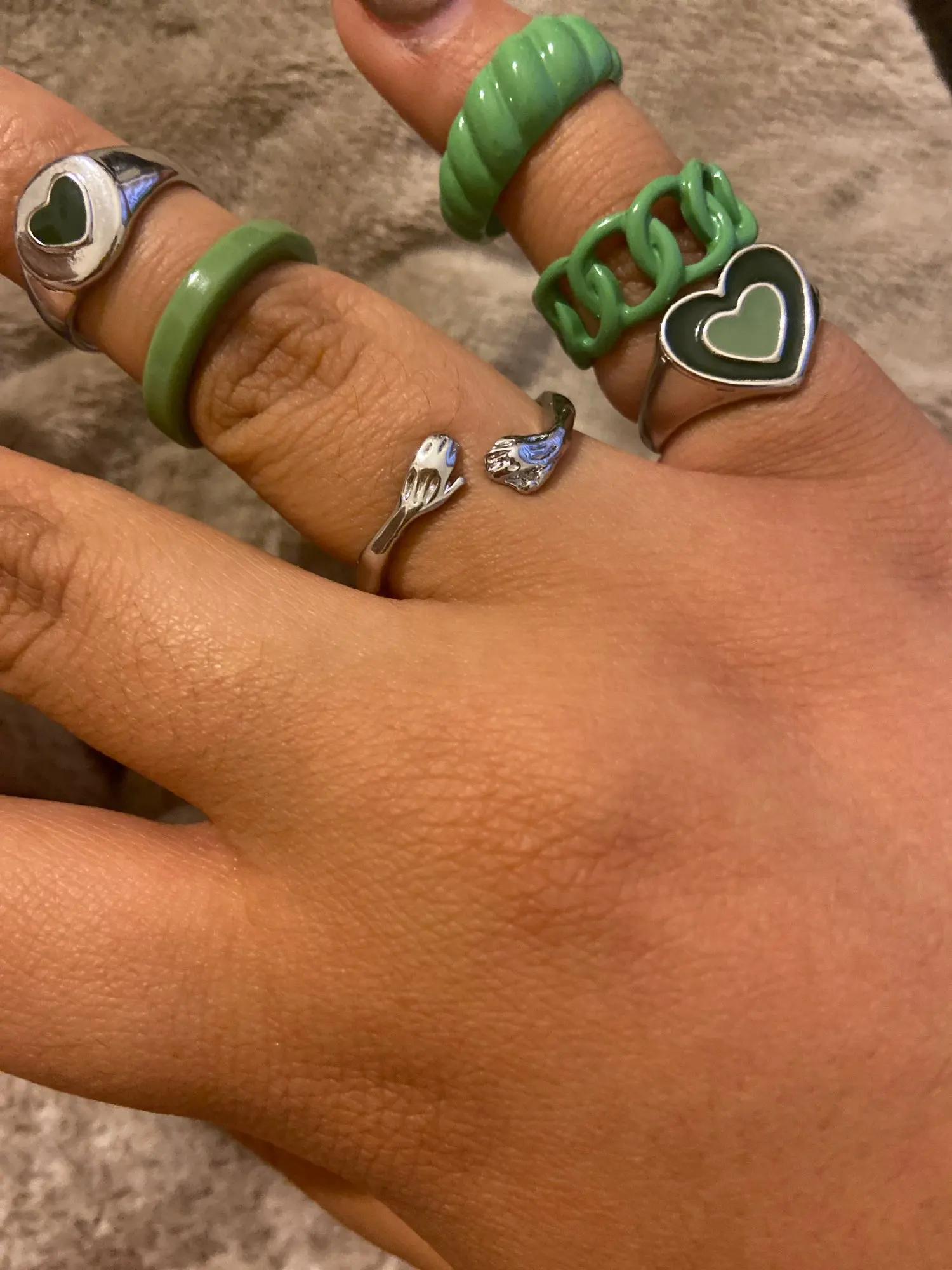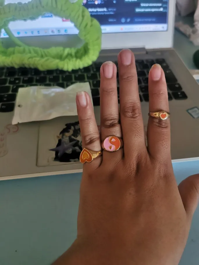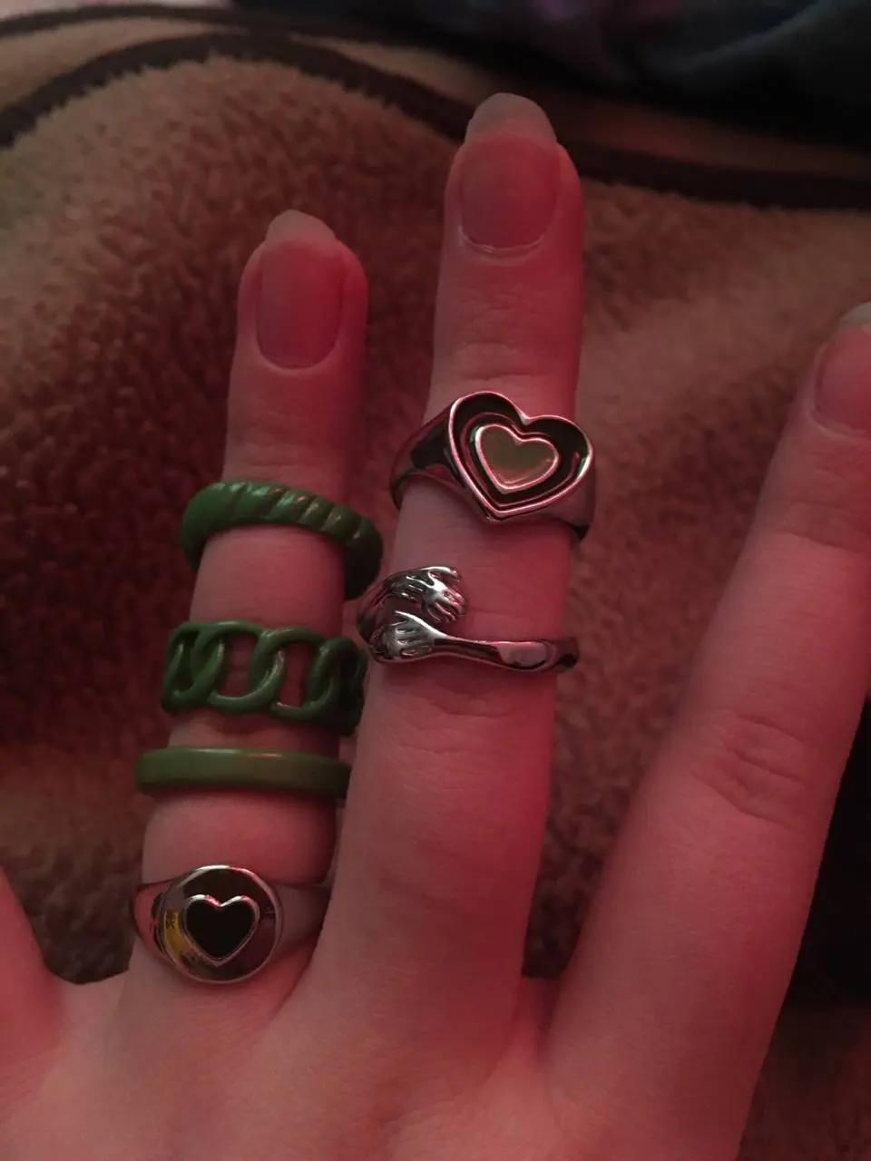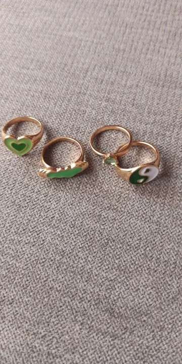 Колечки супер, легко регулируются по диаметру пальца. Одно кольцо (на безымянном) с дефектом окрашивания