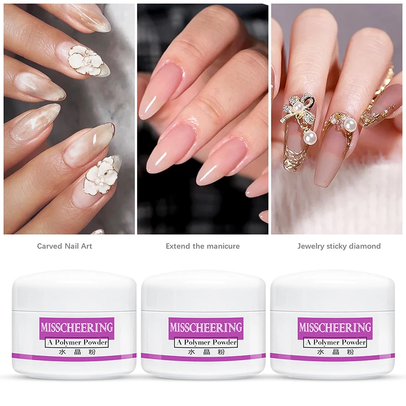 Прозрачный акриловый порошок подходит для удлинения и приклеивания стразы.