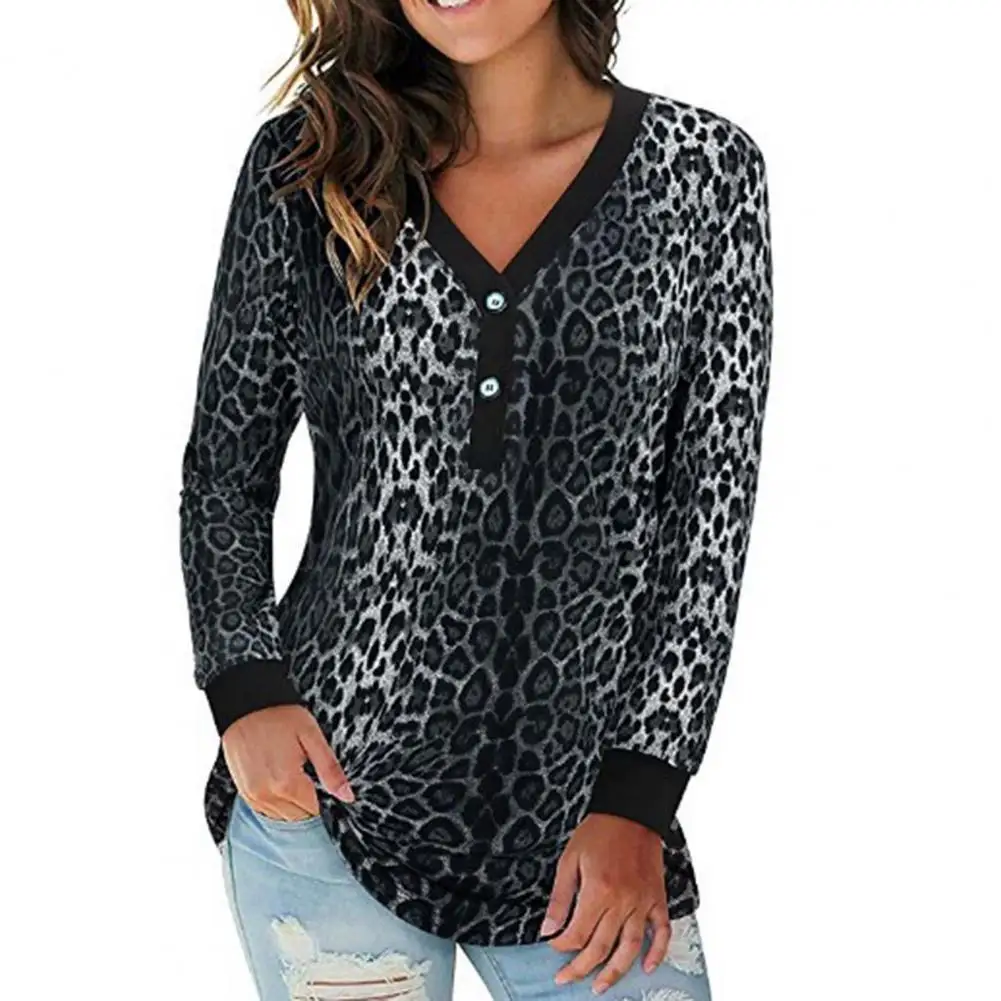 Женская блузка с длинным рукавом, V-образным вырезом и леопардовым принтом