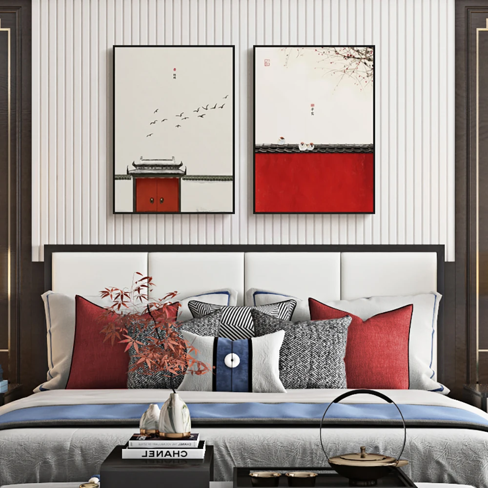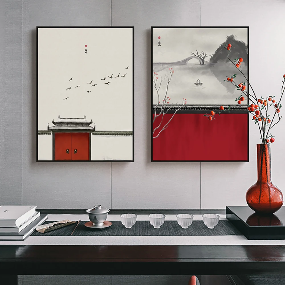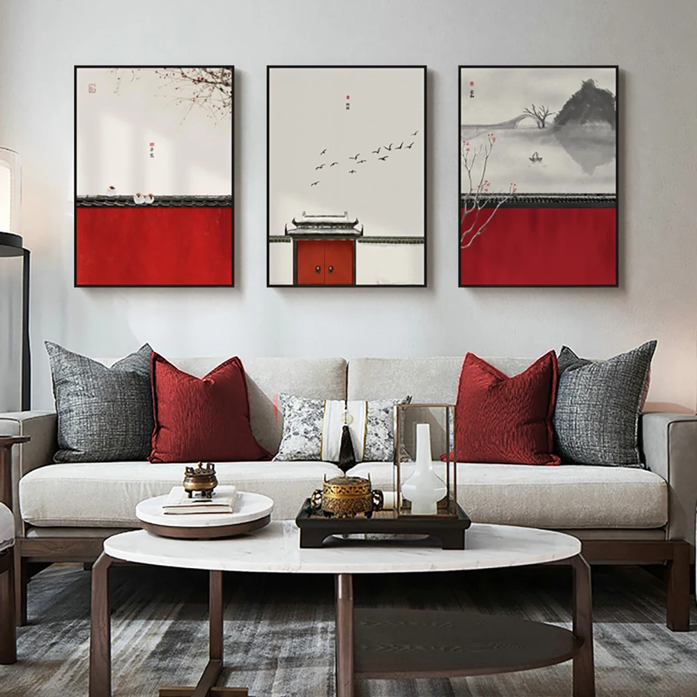 Картина на холсте с изображением Красного здания, пейзажа, настенное украшение в китайском стиле, плакат-Триптих, для современного домашнего декора