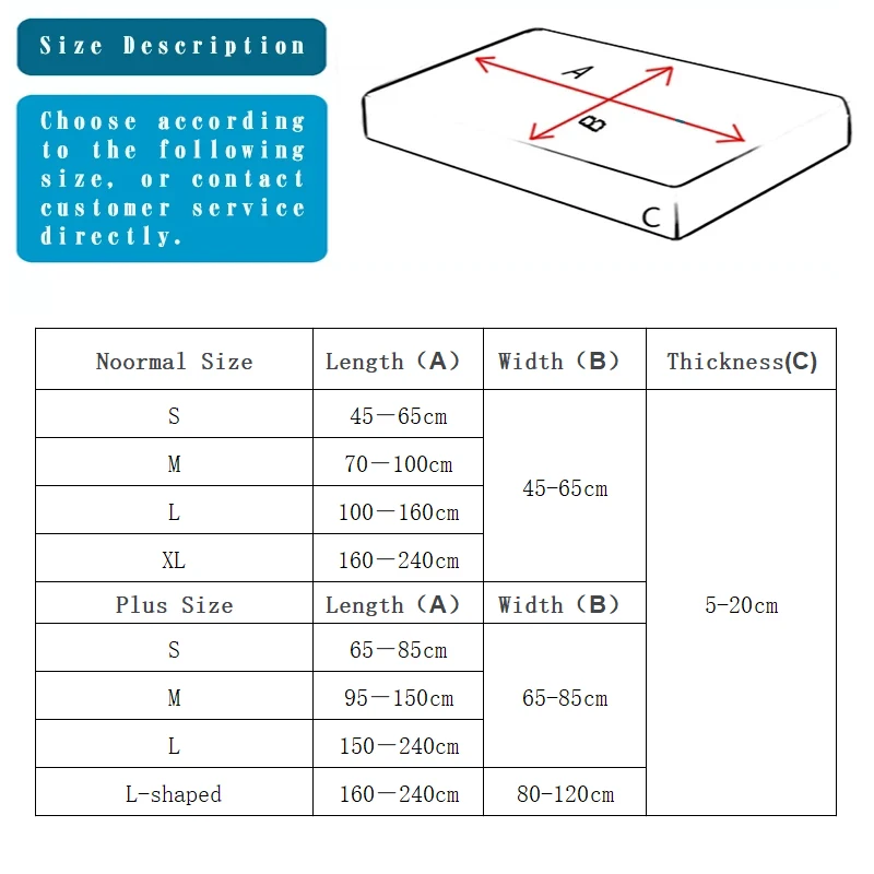 Подходящий размерный ряд:Обычный Размер 1(S) : длина 45-65 см ширина 45-65 см толщина 5-20 смОбычный Размер 2 (м): длина 70-100 см Width45-65cmThickness 5-20 смОбычный Размер 3(L) : длина 100-160 см Width45-65cmThickness 5-20 смОбычный Размер 4(XL) : длина 160-240 см Width45-65cmThickness 5-20 смПлюс Размер 1(S) : Длина 65-85 см ширина 65-85 см толщина 5-20 смПлюс Размер 2 (м): длина 95-150 см ширина 65-85 см толщина 5-20 смПлюс Размер 3(L) : длина 150-240 см ширина 65-85 см толщина 5-20 смL-образный: длина 160-240 см ширина 80-120 см толщина 5-20 смНаволочка: 45*45 см, 50*70 см, 50*80 смДорогие друзья, если у вас есть какие-либо вопросы по поводу размера, пожалуйста, свяжитесь с нами напрямую, мы порекомендуем Вам наиболее подходящий размер. Счастливые покупки