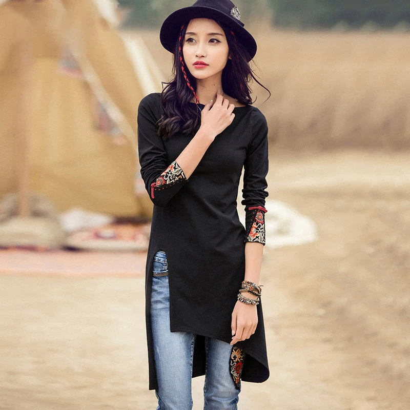Женская длинная футболка с вышивкой в этническом стиле, Элегантная черная футболка с разрезом сбоку, осенние женские Топы с длинным рукавом и вырезом лодочкой