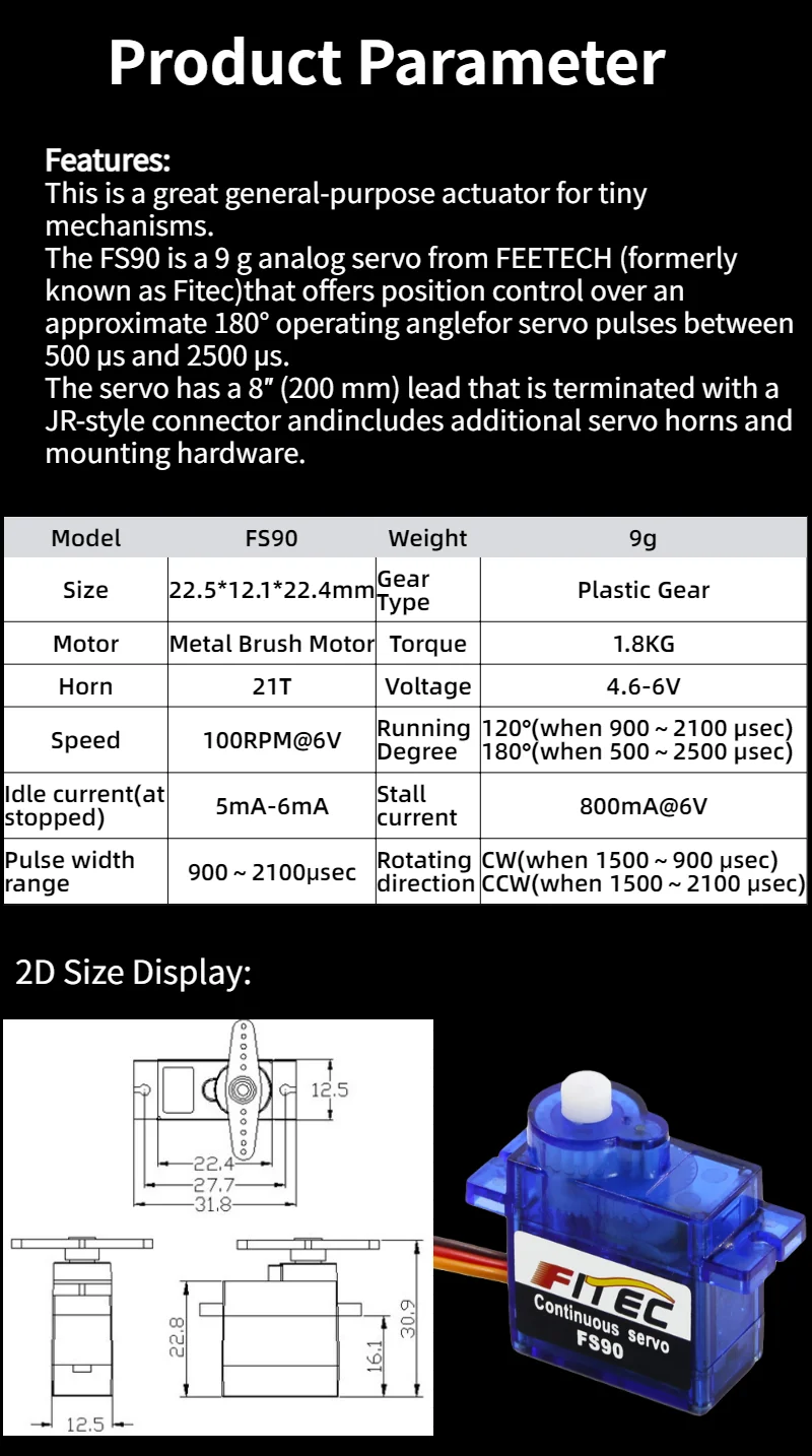 Сервопривод Feetech FS90 Micro 9g 4,8 в 6 в 1,3 кг для радиоуправля...