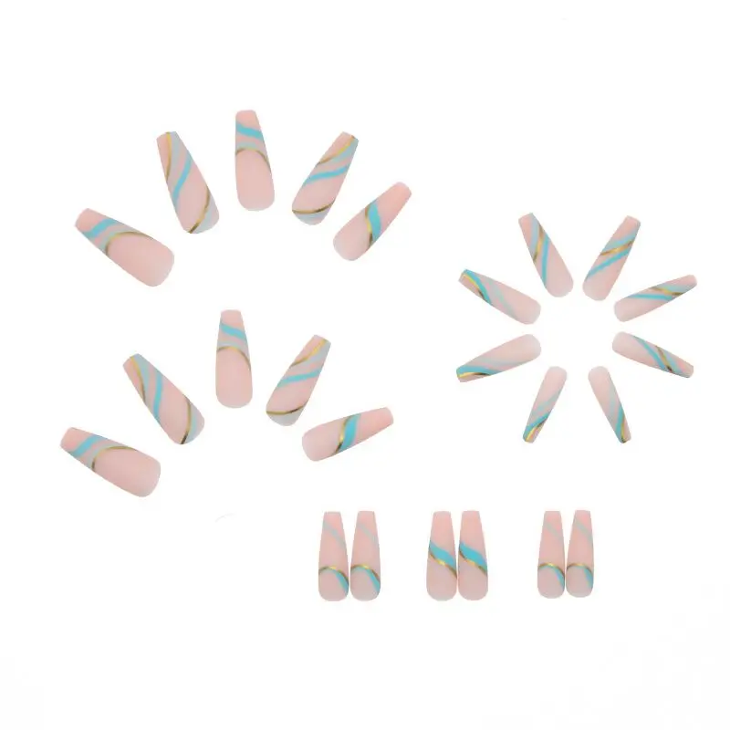 24pcs Nude Fake Nails Long Blue Gold Wave Pattern Coffin False Nails Acrylic Detachable Matte Full Nail Decoration Art Tips