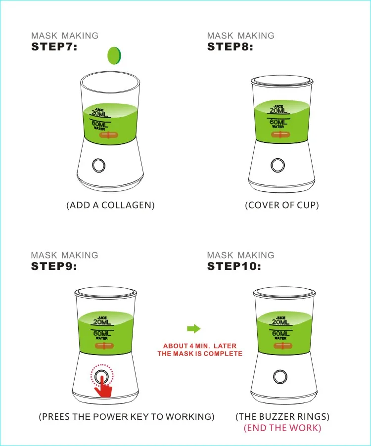 3. Тихий, автоматический, простой в эксплуатации, только одна кнопка питания для управления всеми программами, нажмите кнопку питания, чтобы переключить или подтвердить режим изготовления маски и режим очистки. Экономичный и удобный способ сделать безопасную красоту лица в домашних условиях. Подробные шаги по эксплуатации, пожалуйста, следуйте инструкциям.