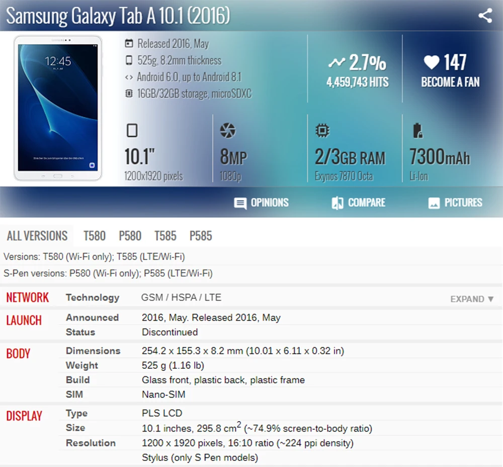 Номер моделиSM-T580/T585