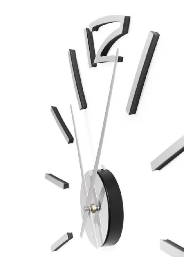 Стильные 3D часы-наклейка диаметром от 60 см до 100 см серебряного цвета. Клеящий слой позволяет разместить часы на различные поверхности. В комплекте к часам идет шаблон для разметки. С его помощью вы сами выбираете желаемый диаметр часов и делаете отметки на стене, куда будут клеиться элементы. Центральная часть с механизмом выполнена из металла, диаметр 10 см. В комплекте есть подробная инструкция по монтажу и креплению часов на стену с иллюстрациями. Для работы необходима 1 АА батарейка (нет в комплекте).