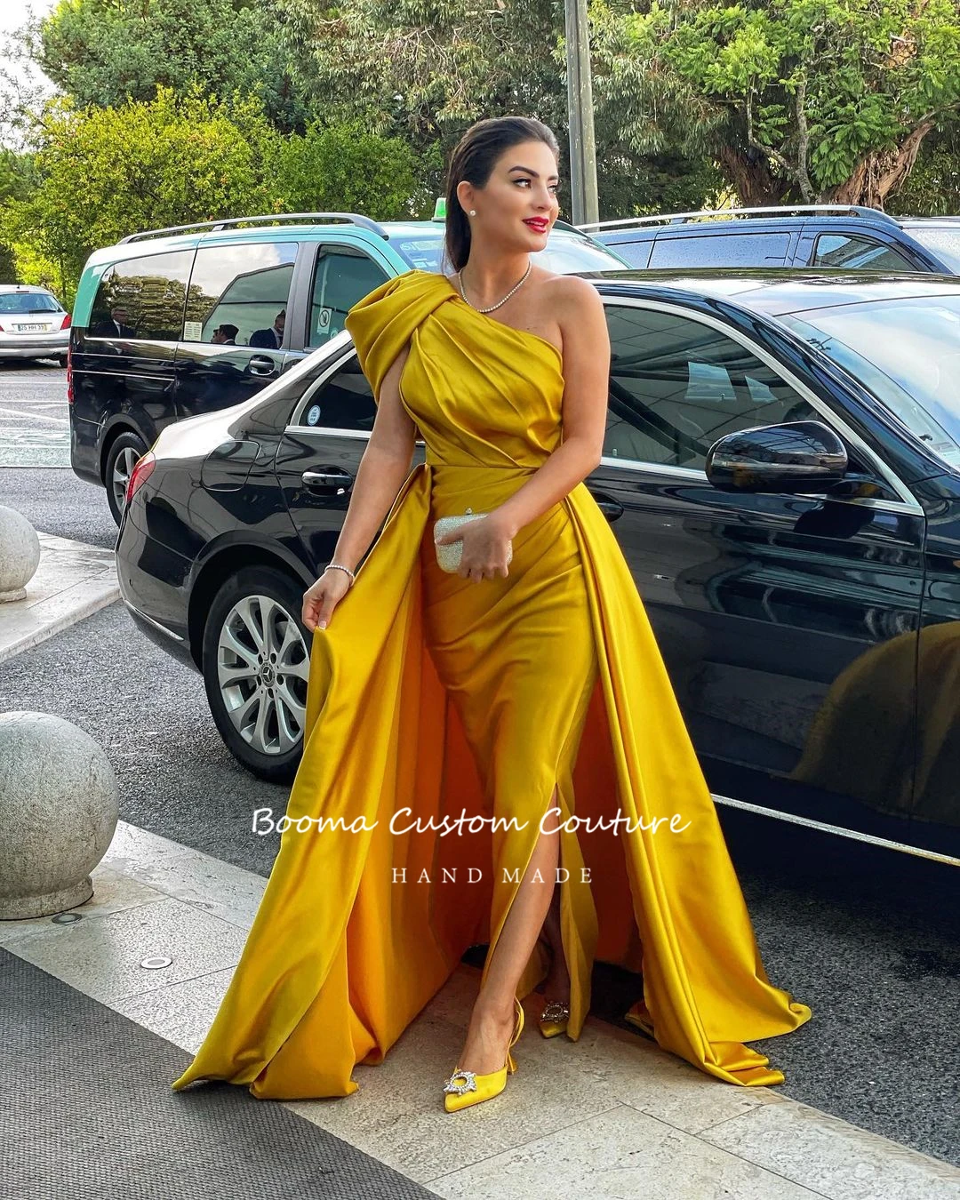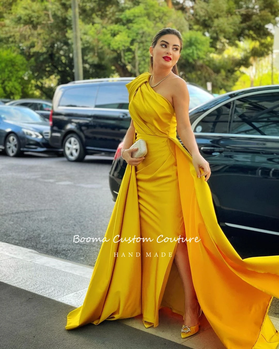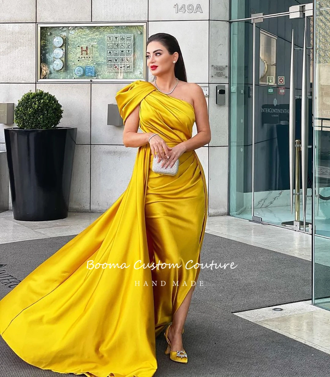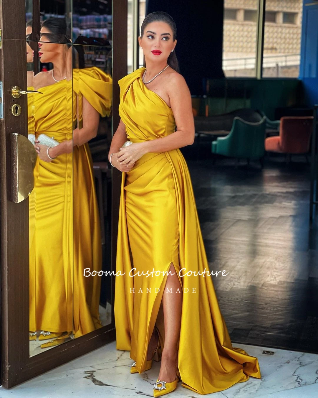 Женское атласное платье на одно плечо Booma, желтые вечерние платья с драпировкой, платья знаменитостей с Боковым Разрезом, Длинные вечерние платья