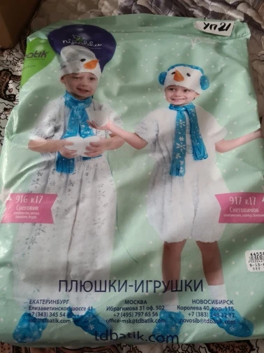 Веселый зимний образ Снеговичка подарит ребенку яркий праздник в кругу друзей и близких. Замечательный костюм из пушистого мягкого плюша не только красиво смотрится, но еще и очень удобен. Главным акцентом наряда стали голубые наушники на шапочке, который делают образ еще более интересным. Костюм также состоит из белого комбинезона и голубых носочков, имитирующих башмаки.Особенности:- Кудрявый плюш, из которого сделан костюм, напоминает снег.- С короткими рукавами и штанишками.- К воротнику пришит шарфик голубого цвета.- Декоративные пуговицы на груди.- Комбинезон застегивается на молнию сзади.- Резинка на талии.- Голубые носочки со снежинками.- Нос-морковка, глазки-бусинки и наушники на шапке.