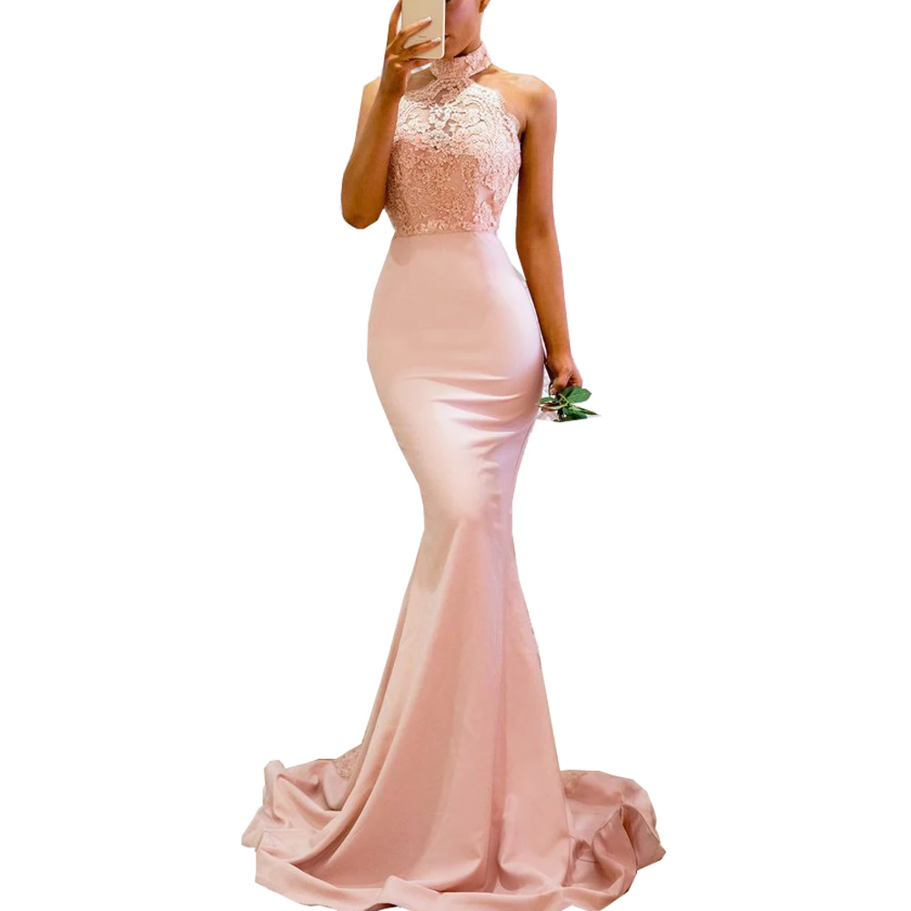 Женские длинные платья с кружевным разрезом, облегающее розовое бальное Вечернее платье с открытой спиной и лямкой на шее, вечернее платье
