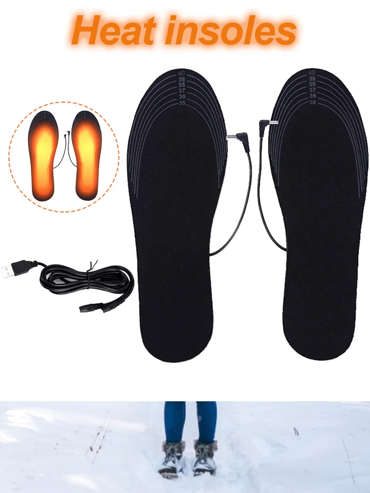 Bullet Points: 1、Can be Cut: Can be cut according to dotted line based on your needs, suitable for all kinds of shoes, 35-46 yards, foot length 230-280mm.2、High Heating Temperature: 40-55 degree high temperature heating, long service life.3、Water Washable: Can be washed directly without affecting effect, the material is waterproof, needs to be completely dried before use.4、Soft and Comfortable: Heat up the whole sole area, heat evenly, soft and comfortable.5、Blood Circulation: Protect your feet from injury in cold winter, promote blood circulation, of great benefit to body.Specification: Insole fabric: EVA elastic fiberTemperature: 40-50 degrees, depending on the environmentSuitable size: 35-40 size: 230mm-250mm41-46 size: 255-280mm (can be cut out to the size you want)Voltage: 5V2A2 heating methods:1. Home plug-in heats up, suitable for sitting.2. Powered by power bank, can walk freely outdoors.Packing List: 1*USB Charging Cable1 Pair of InsolesNote: This heating insole does not have battery, and cannot store electricity or heat. The insole needs to be powered on to generate heat. It cools down when the power is turned off. It can also be used with a power bank for heating outdoors. Make sure that the power bank output is above 5V/2A. (This product does not contain power banks).