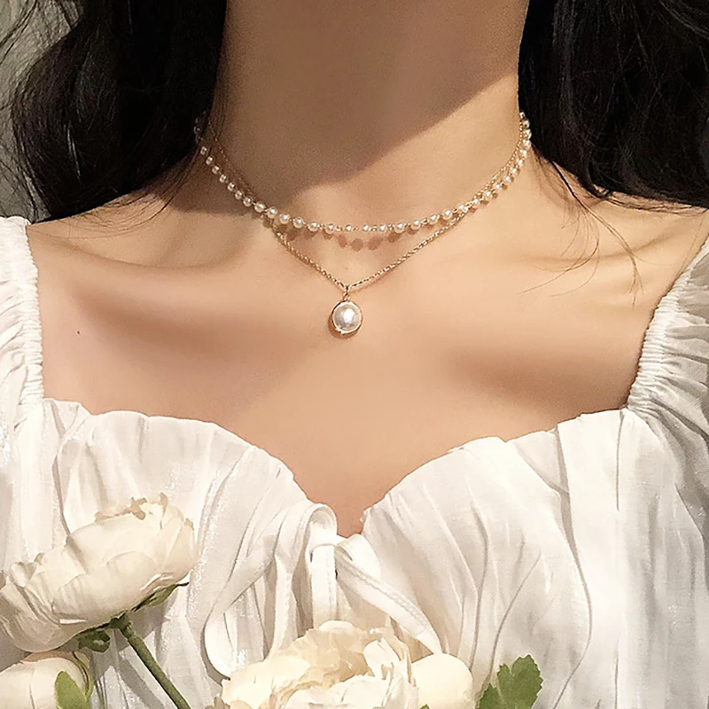 Модное жемчужное ожерелье-чокер, милая двухслойная цепочка, кулон-б...